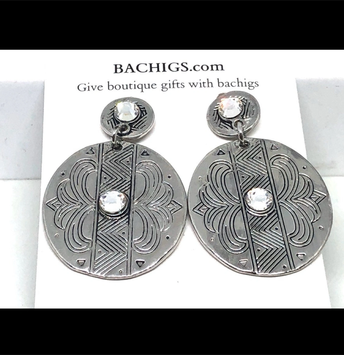 Beautiful silver tone earrings. Large round discs feature etched designs and clear crystals. Perfect for adding a touch of elegance to any outfit.