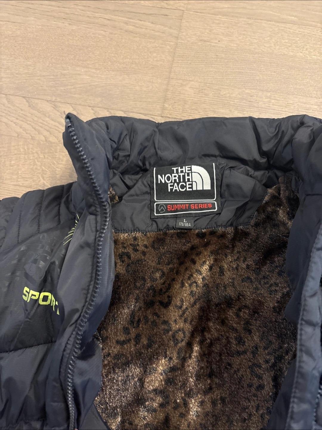 Black puffer jacket. Zipper closure. Long sleeves. Features a small graphic on the left breast and The North Face logo on the right. Suitable for colder weather.