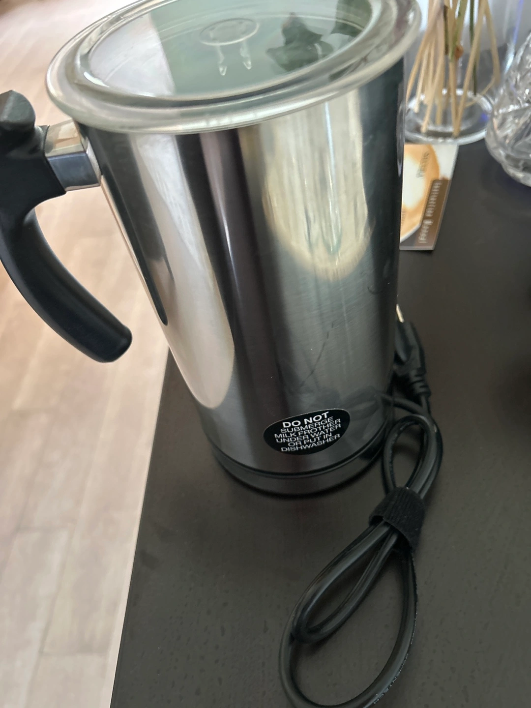 Stainless steel milk frother. Automatic operation. Includes instruction manual. Great for lattes and cappuccinos. Pick up area Bayview and Sheppard.
