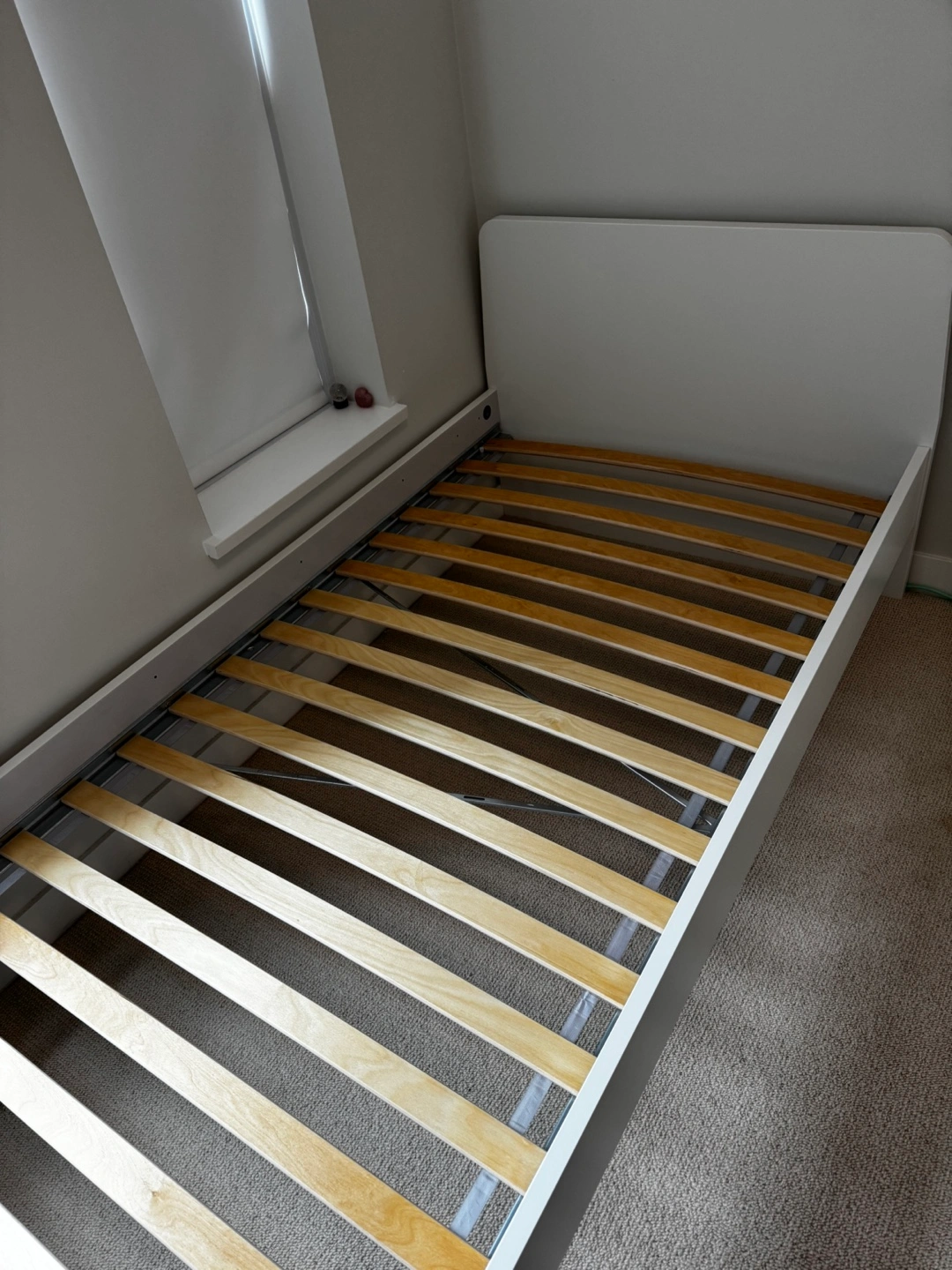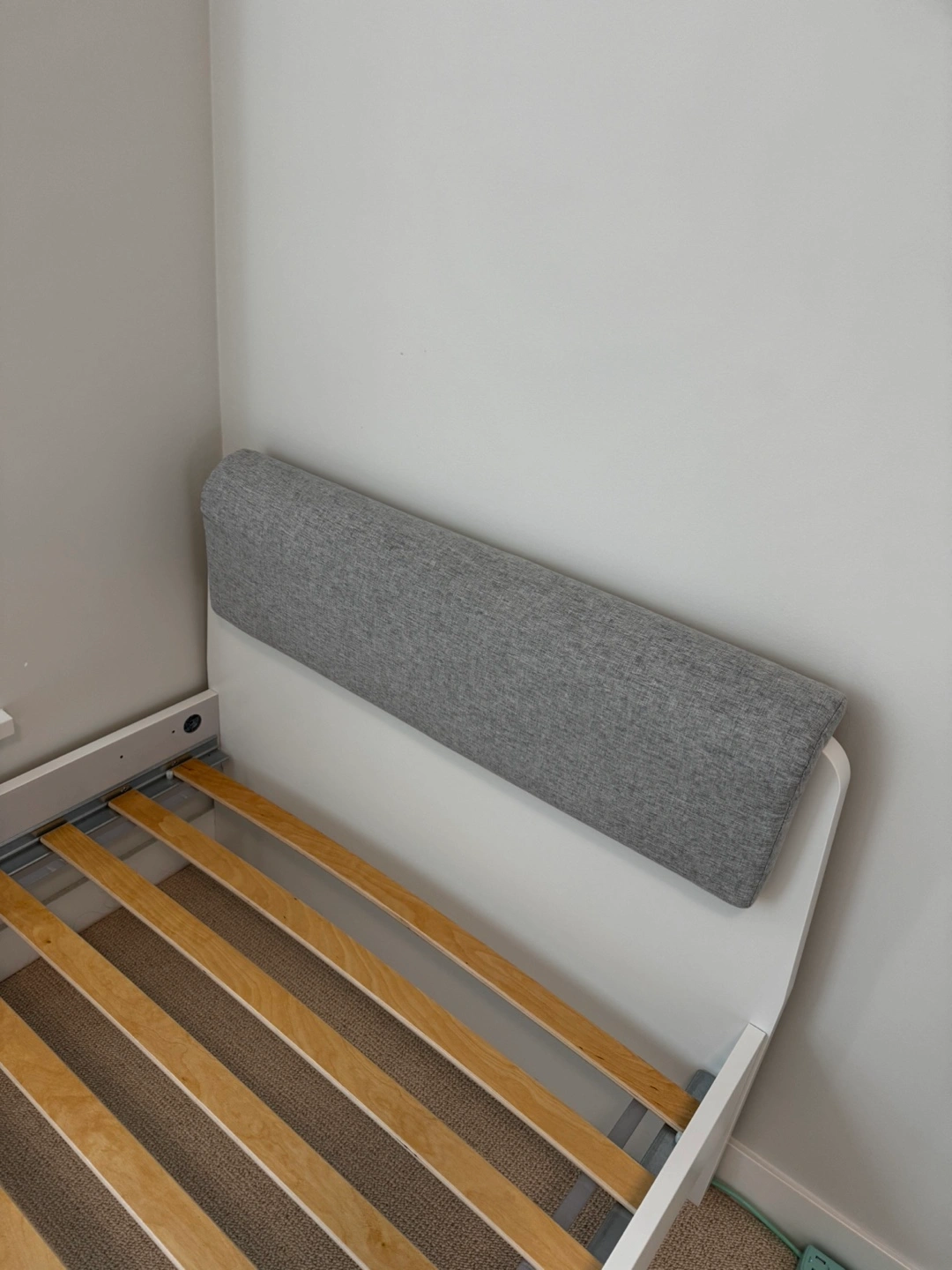 White twin bed frame with headboard. Includes wooden slats and Specially made grey cushion. Good condition.