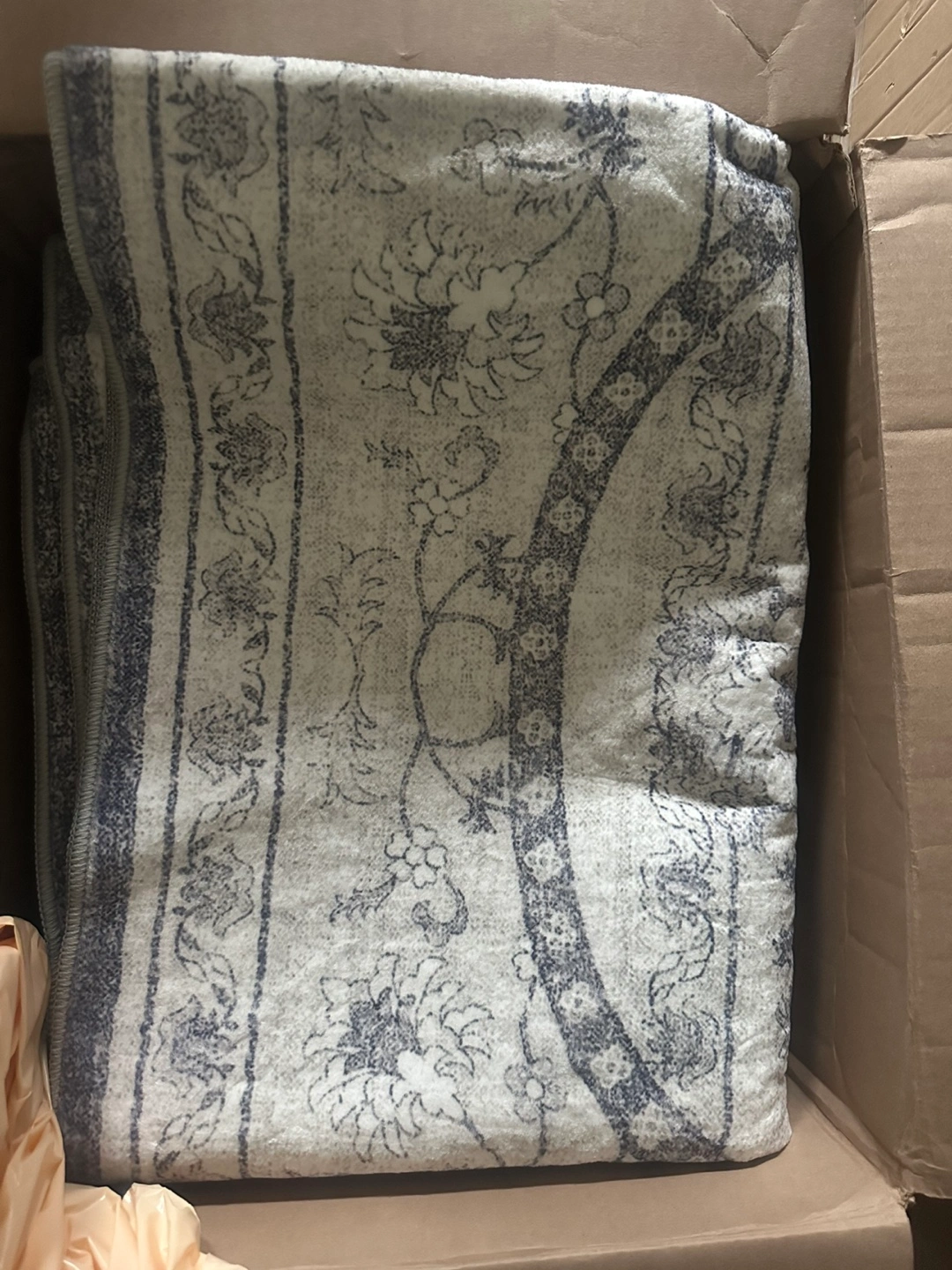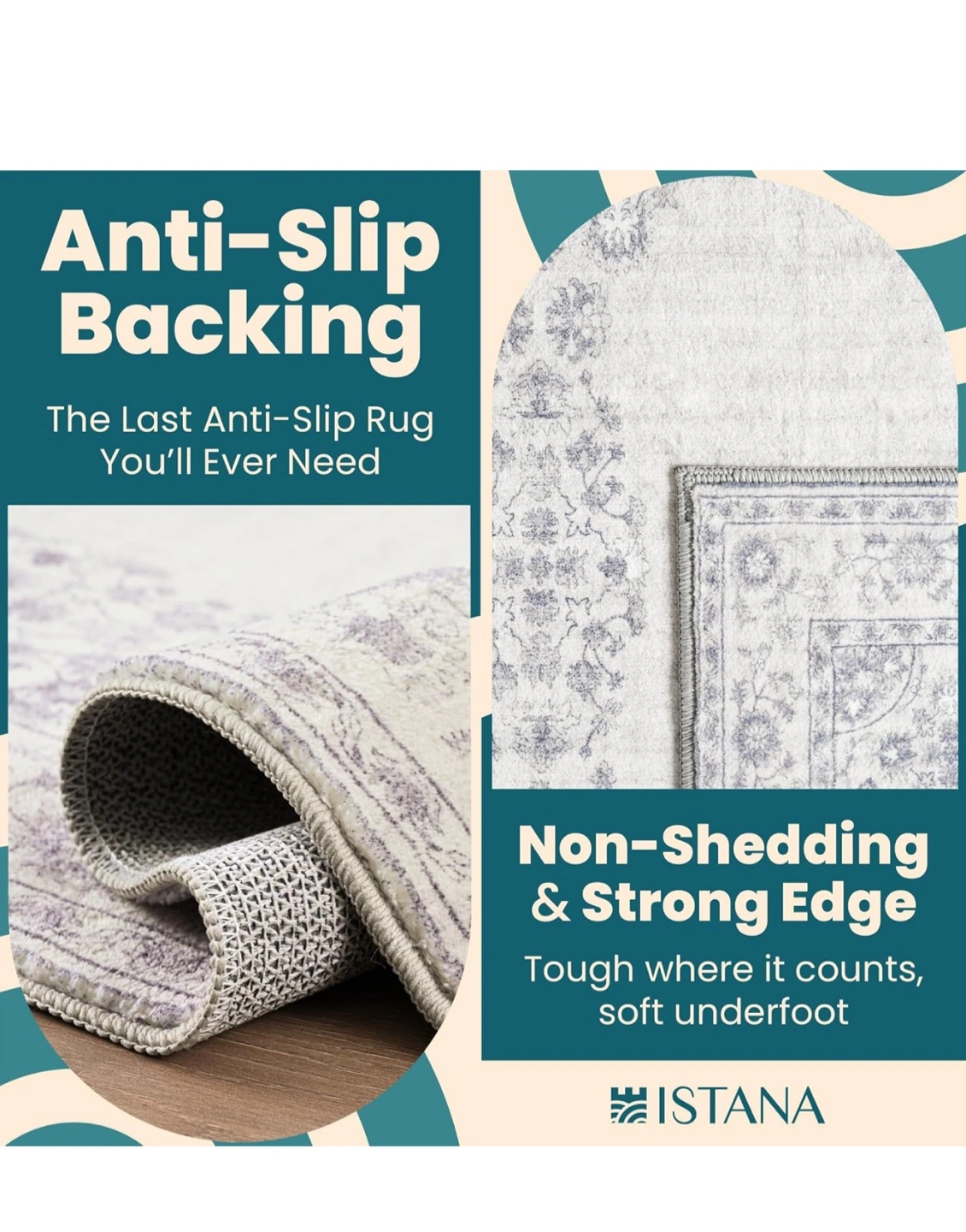 Beautiful area rug. Features an anti-slip backing, strong edges, and a 7mm pile height. Machine washable and foldable for easy cleaning and storage. Luxury feel, gentle on skin. Off-white colour with a light purple floral pattern.