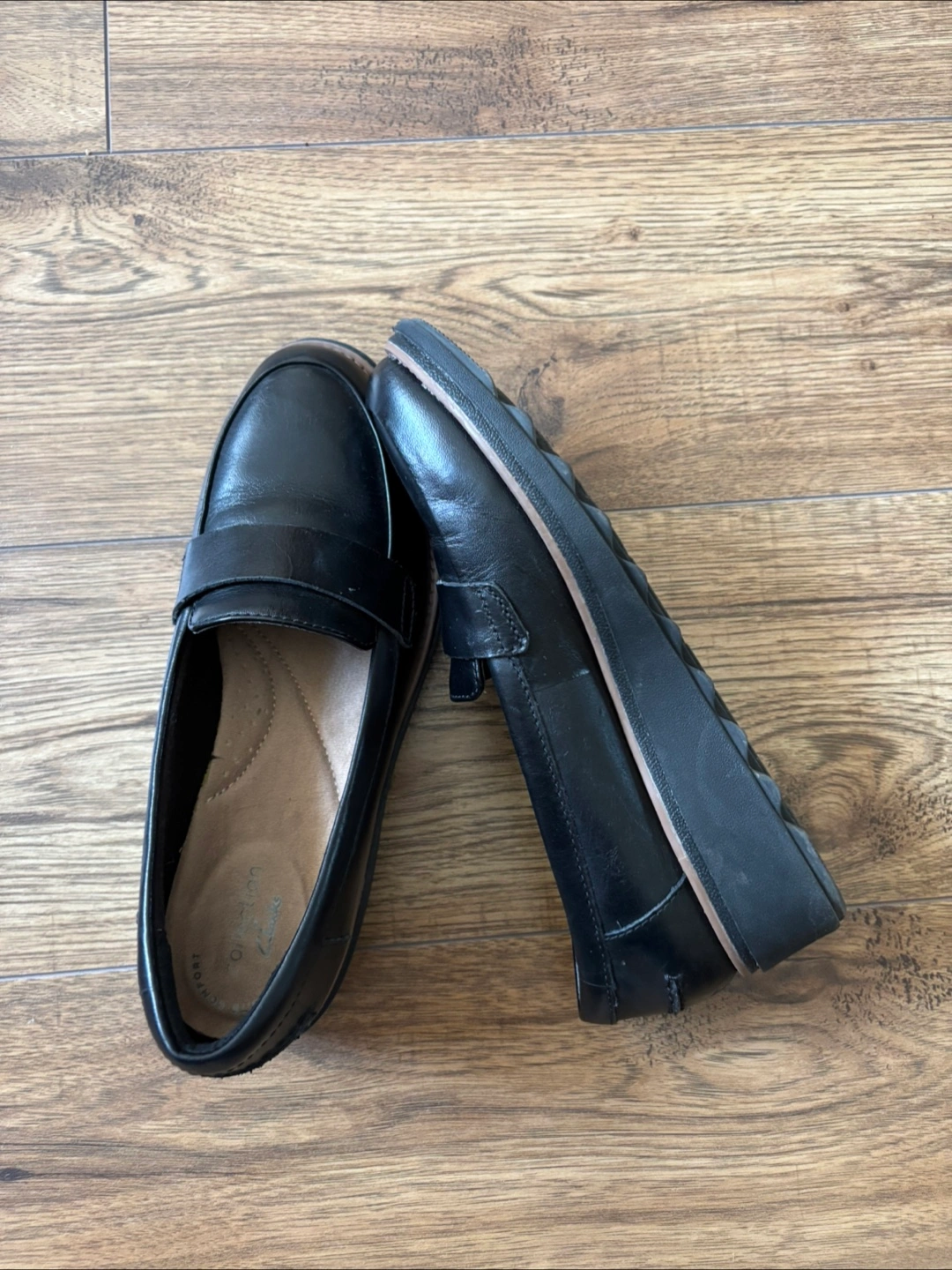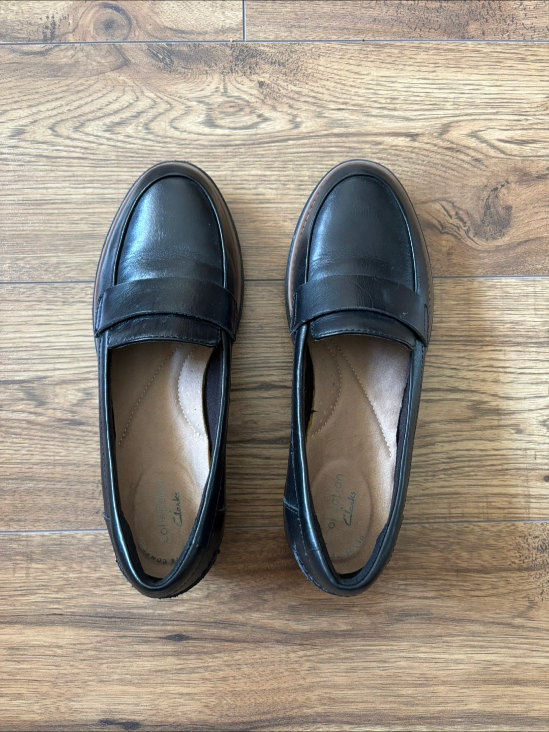 132Size 6 Clark’s black leather loafers. Great for work or casual wear. Slight platform sole. $40 cash only
