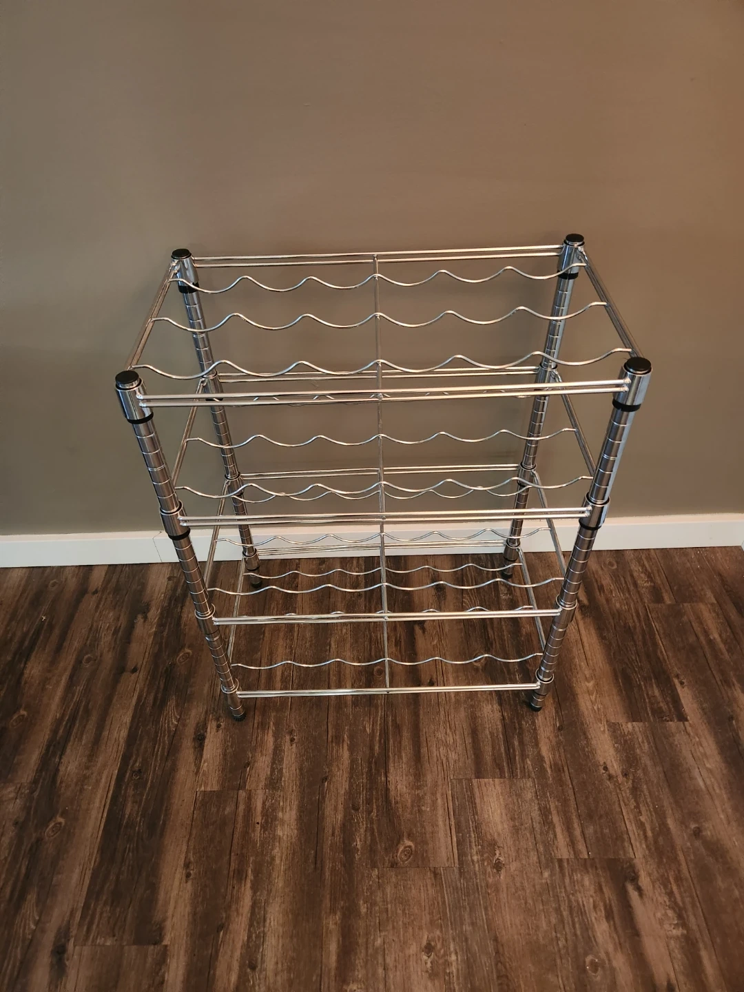 This is a chrome metal wine rack shelving unit. It has four shelves designed to hold wine bottles. The unit is made of metal with a chrome finish. It's great for organizing your wine collection in a cellar or kitchen. Adjustable