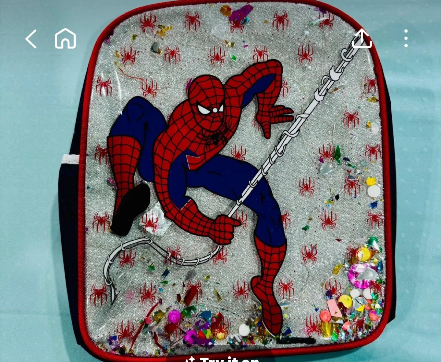Spiderman backpack with glitter and confetti inside the clear front panel. It has a main zippered compartment and a side pocket. Perfect for young Spiderman fans!