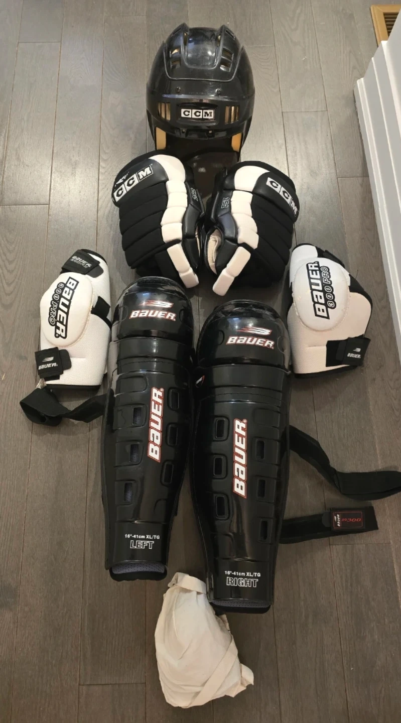 Includes a CCM helmet and Bauer shin pads, elbow pads, protective cup, and gloves. Shin pads are 16"-41cm XL/TG. Elbow pads are 9.0 Pro. A great set for any hockey player!