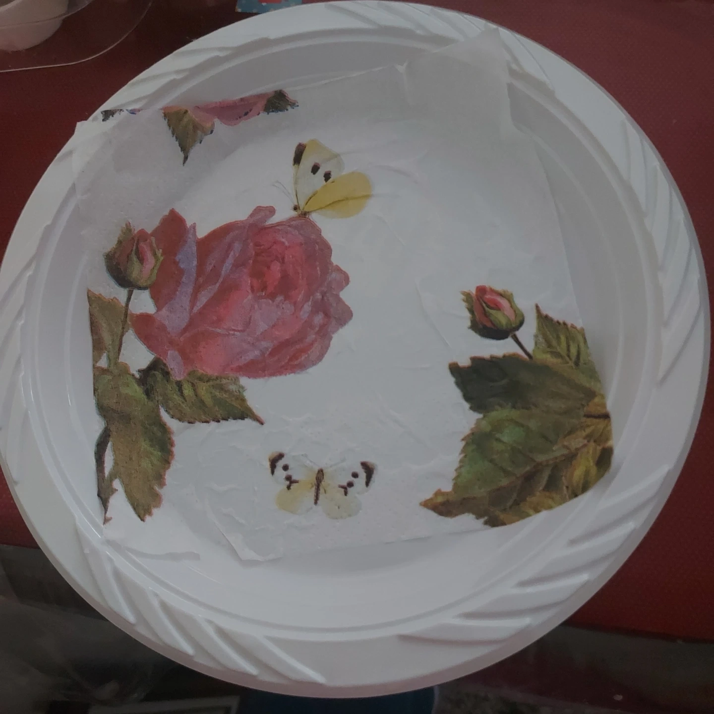 White Plastic Plate with Rose and Butterfly Decal