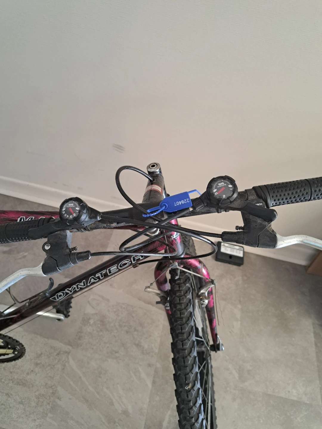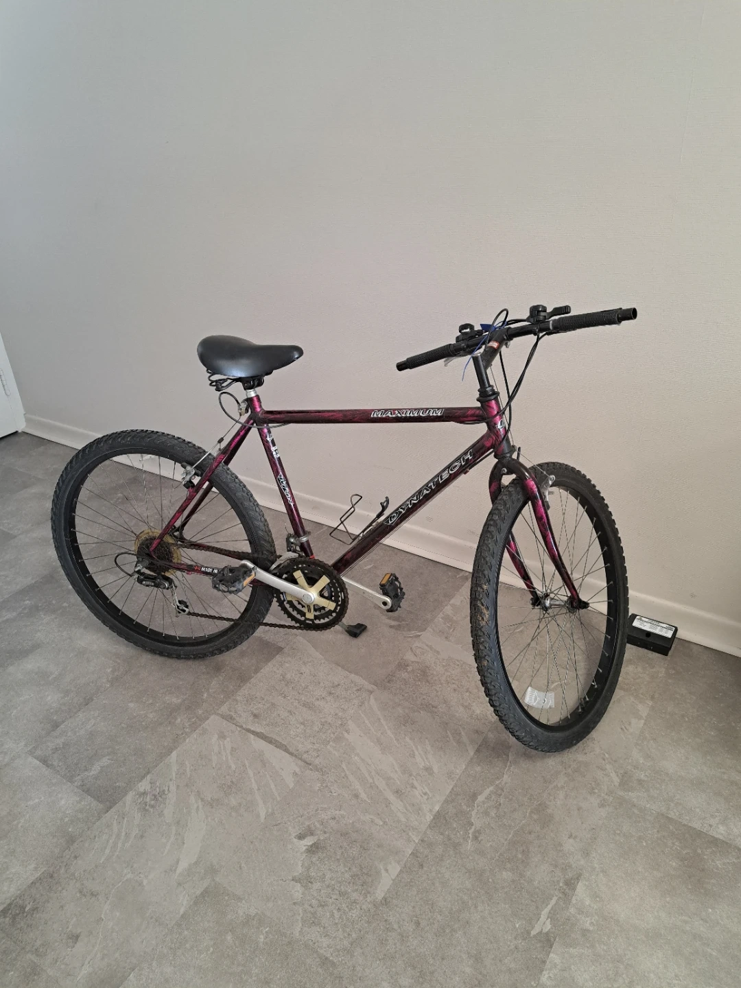 This is a Dynatech mountain bike with a dark pink and black marbled frame. It features knobby tires suitable for off-road use and has a water bottle cage attached. This bike is great for recreational riding and hitting local trails.