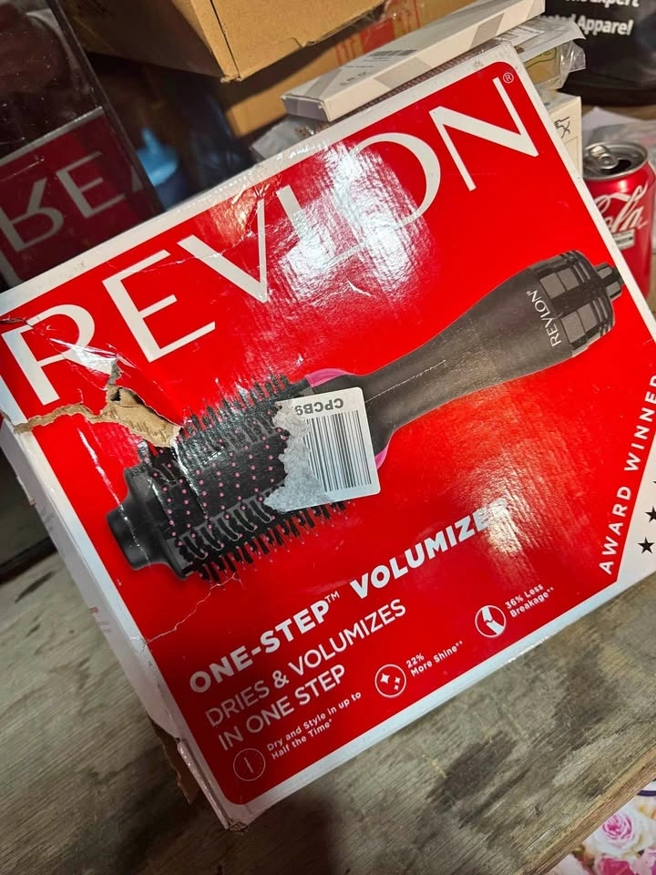 New Revlon hot air brush dries and volumizes hair in one step. This black and pink styling tool has an improved motor for better performance. It is an award winning design that helps with shine and reduces breakage.