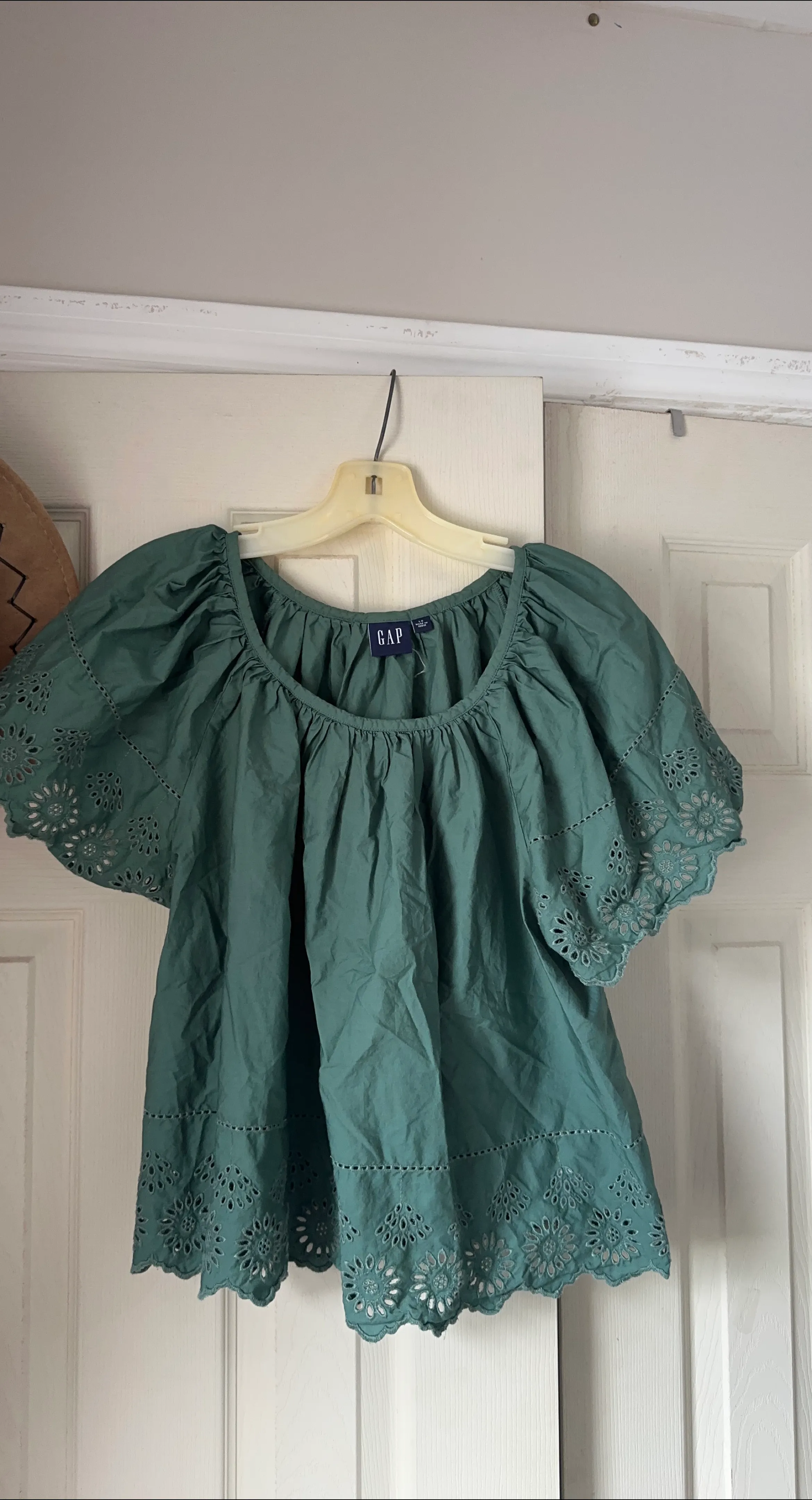A lovely green eyelet top from GAP, size large. It's in great condition and features a beautiful eyelet design around the sleeves and hem. Perfect for a casual, breezy look!