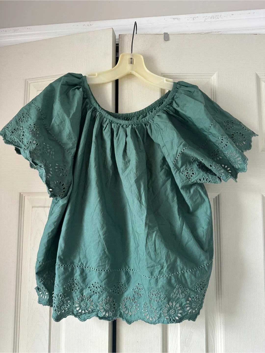 A lovely green eyelet top from GAP, size large. It's in great condition and features a beautiful eyelet design around the sleeves and hem. Perfect for a casual, breezy look!
