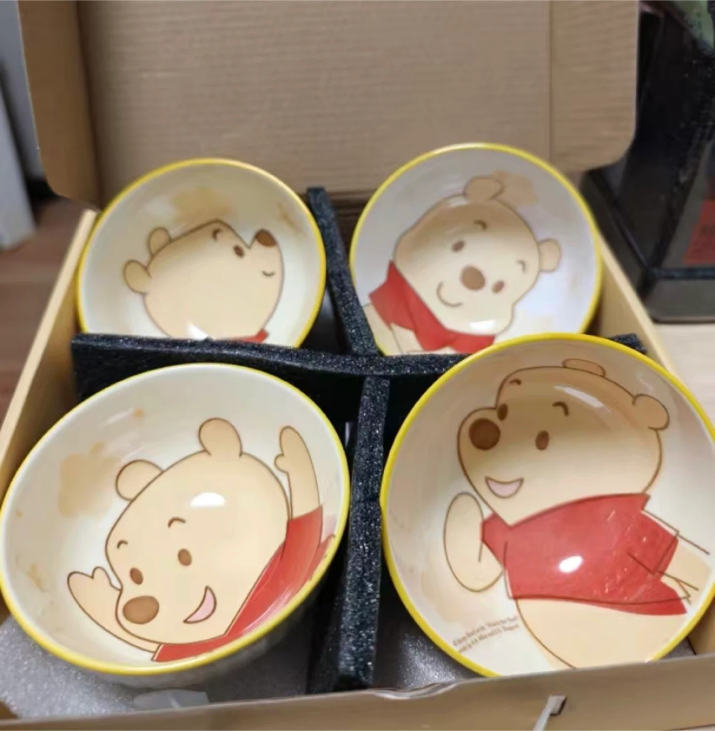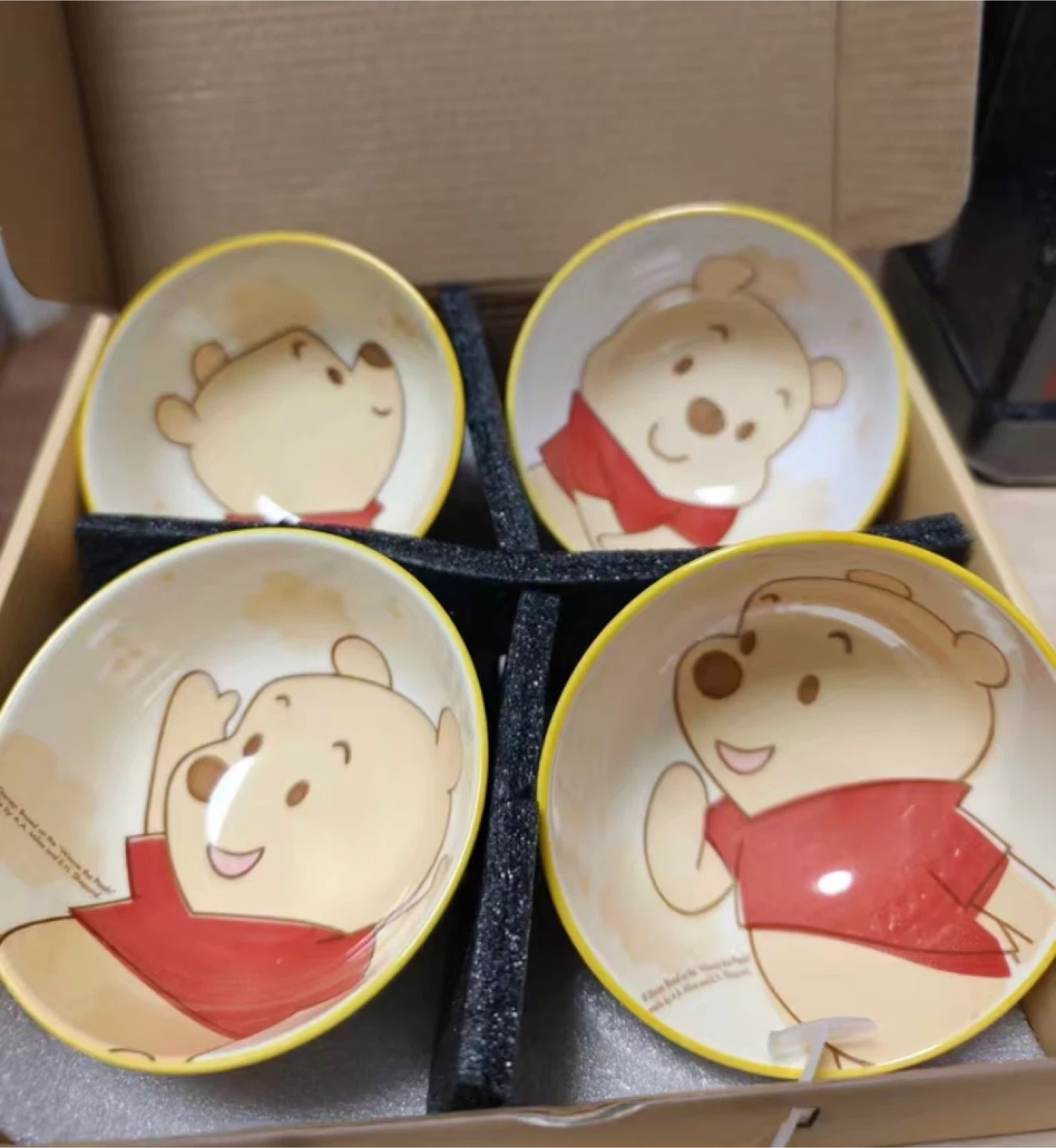 Set of four Winnie the Pooh ceramic bowls. Each bowl features a different illustration of Pooh. They're perfect for snacks or small servings. These bowls come in a gift box.