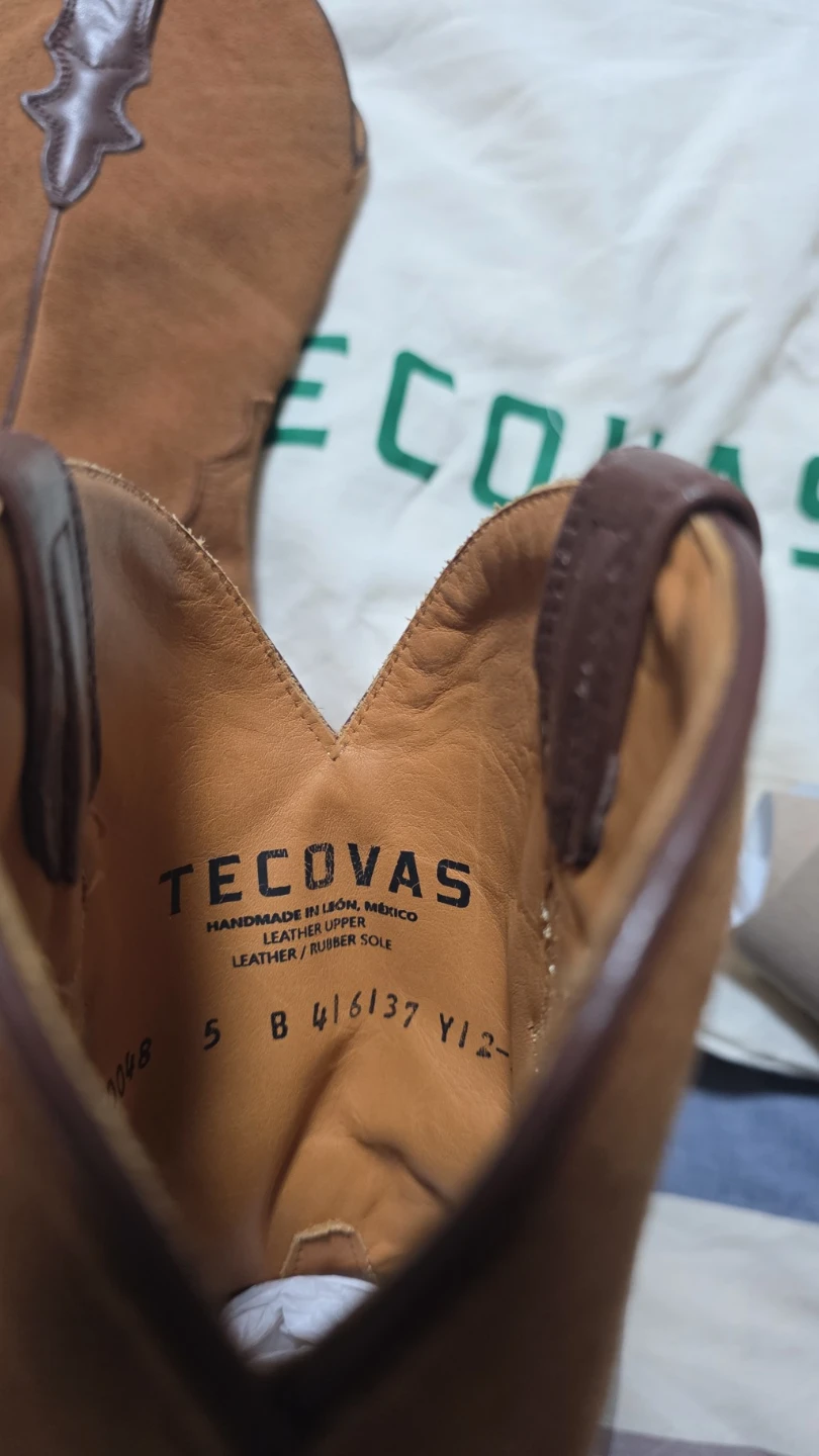 Tecovas cowboy boots. Genuine leather upper and leather/rubber sole. Handmade in Leon, Mexico. These boots are a size 5 B.