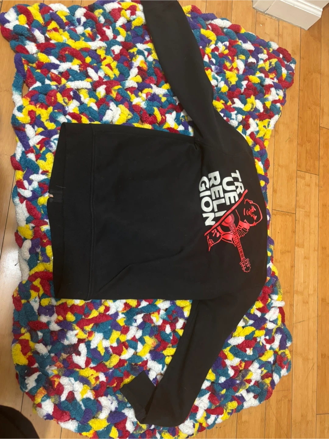 True Religion black zip-up hoodie in good condition. Features the logo on the front and back. Great for layering or wearing on its own!