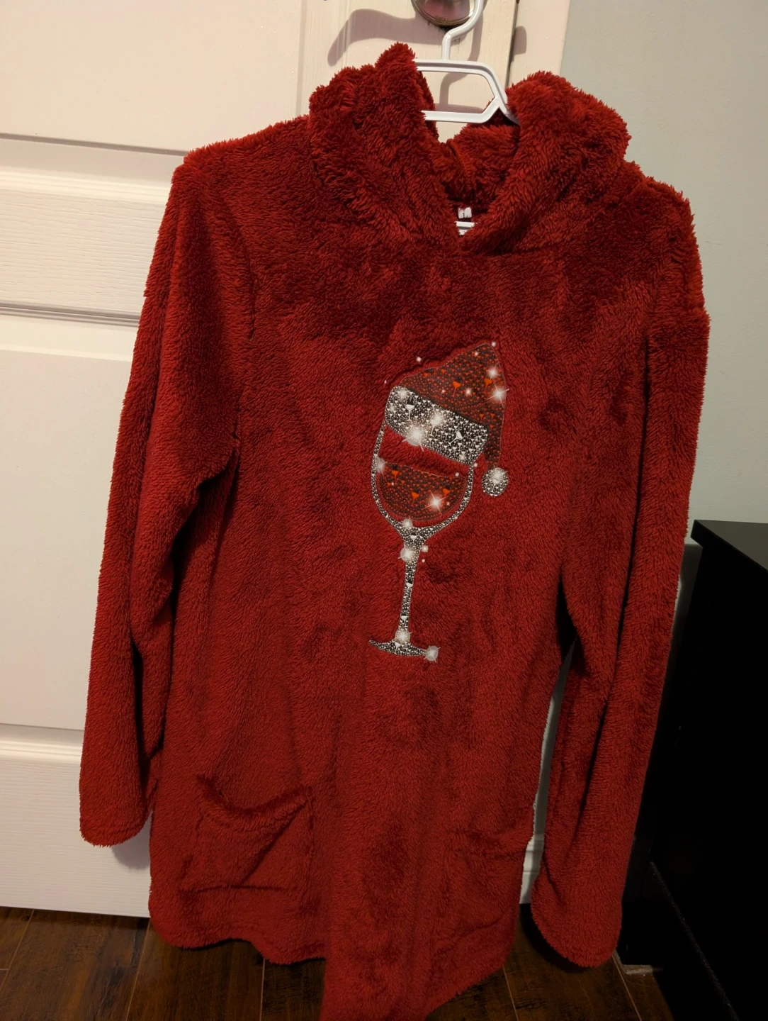 Cozy red fuzzy pajama top. It features a sparkly wine glass design with a Santa hat. Includes a front kangaroo pocket. Fun for lounging!