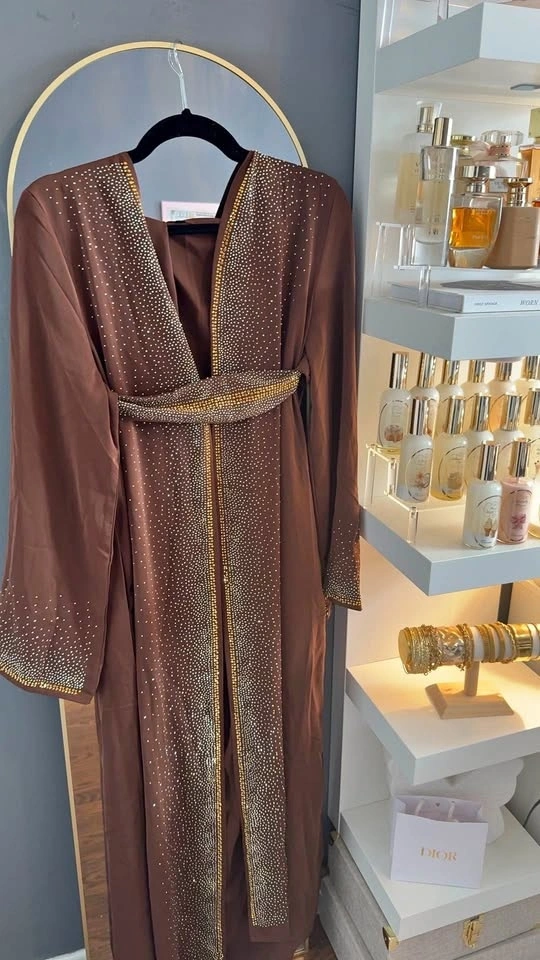 Elegant brown abaya with stunning gold-toned sparkle detailing throughout. Features a flowing, graceful silhouette with a matching belt to cinch the waist for a flattering fit.