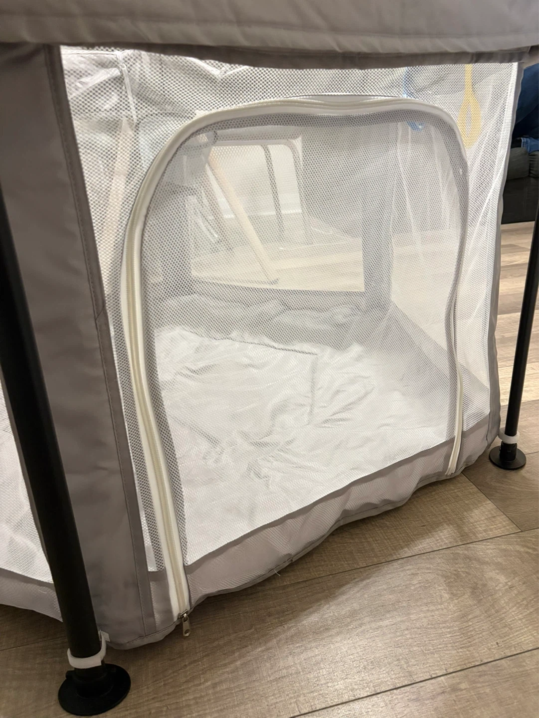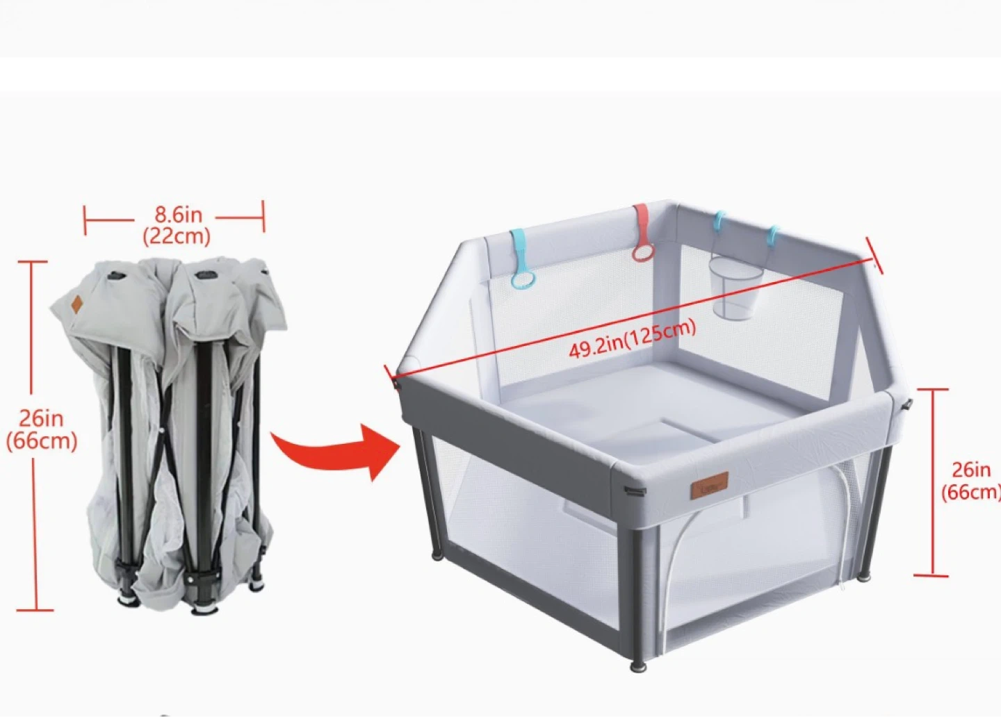 This baby playpen is large and hexagonal, measuring 49.2 inches (125cm) across. It features a grey fabric exterior with mesh sides for ventilation. It's lightweight and foldable for easy storage and transport, with dimensions of 26 inches (66cm) in height and 8.6 inches (22cm) when folded.