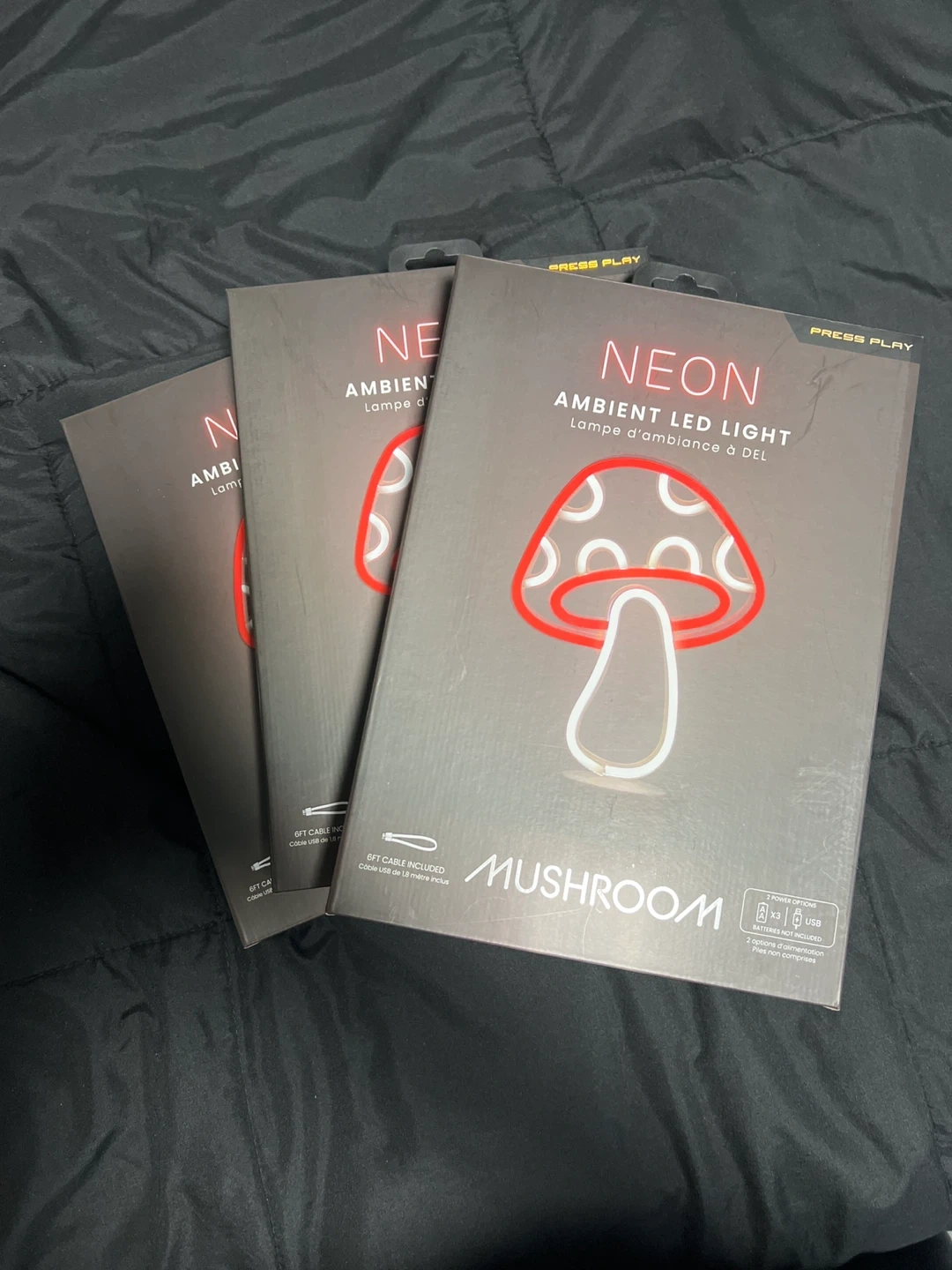 Three brand new, neon mushroom ambient LED lights. Each light includes a 6ft USB cable. Can also be used by with 3 AA batteries. Batteries not included. 20 for each light