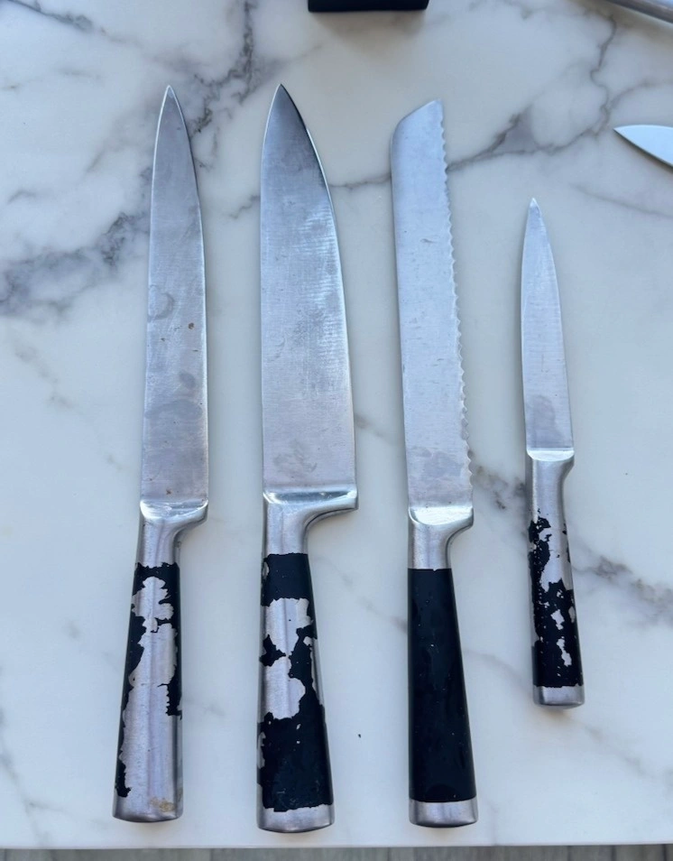 Kitchen knife bundle including: 4 large kitchen knives (blades work great – handles show cosmetic wear where the paint has chipped), 3 small knives, and a knife storage block. Good everyday kitchen knives with plenty of life left. Great starter set for a kitchen.
