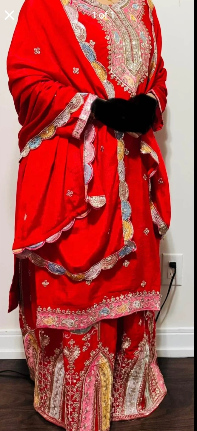This is a vibrant red shalwar kameez set featuring intricate embroidery. It includes a matching dupatta with decorative borders. The fabric appears to be a smooth, possibly silk or silk-blend material.