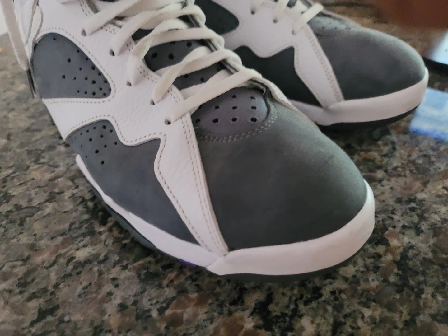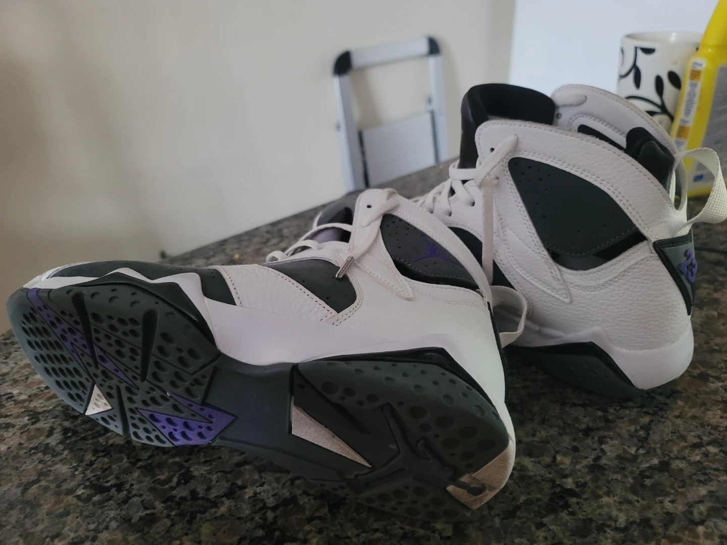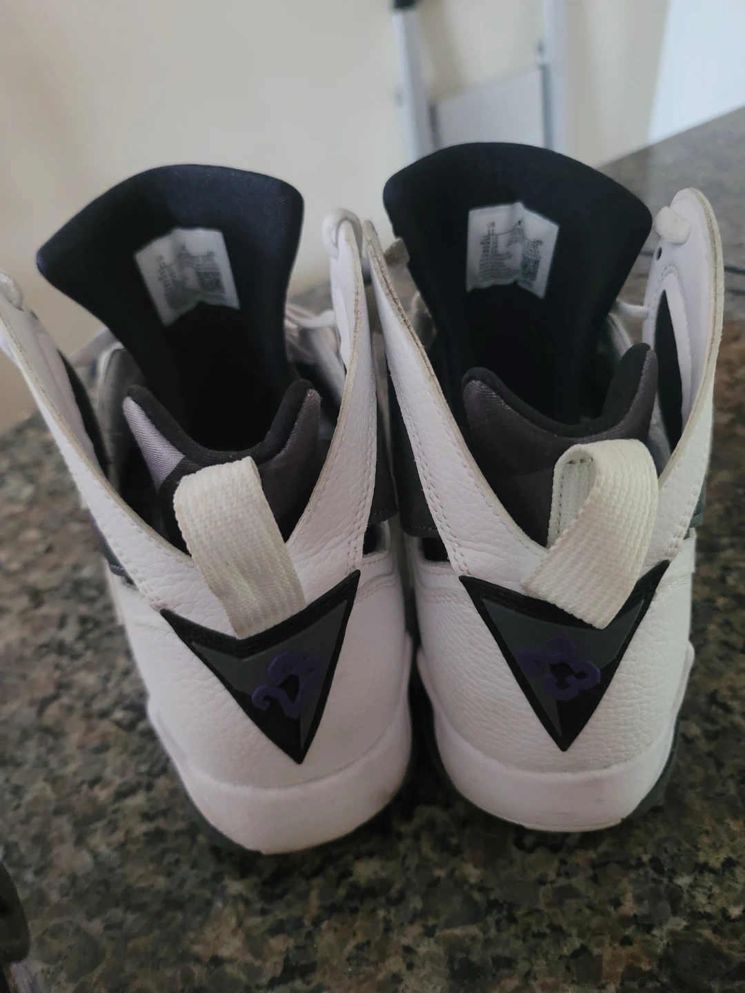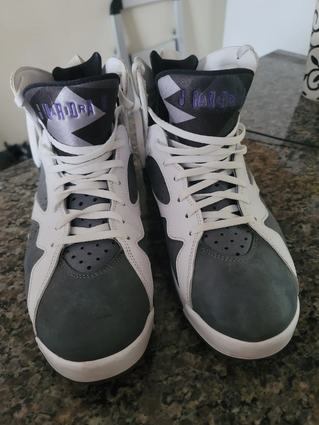A pair of Air Jordan 7 Retro sneakers in the classic 'Flint' colourway. These high-top basketball shoes feature a mix of leather and nubuck with signature Jordan branding details. Authentic. Excellent for collectors or everyday wear! No Box. Pick up only