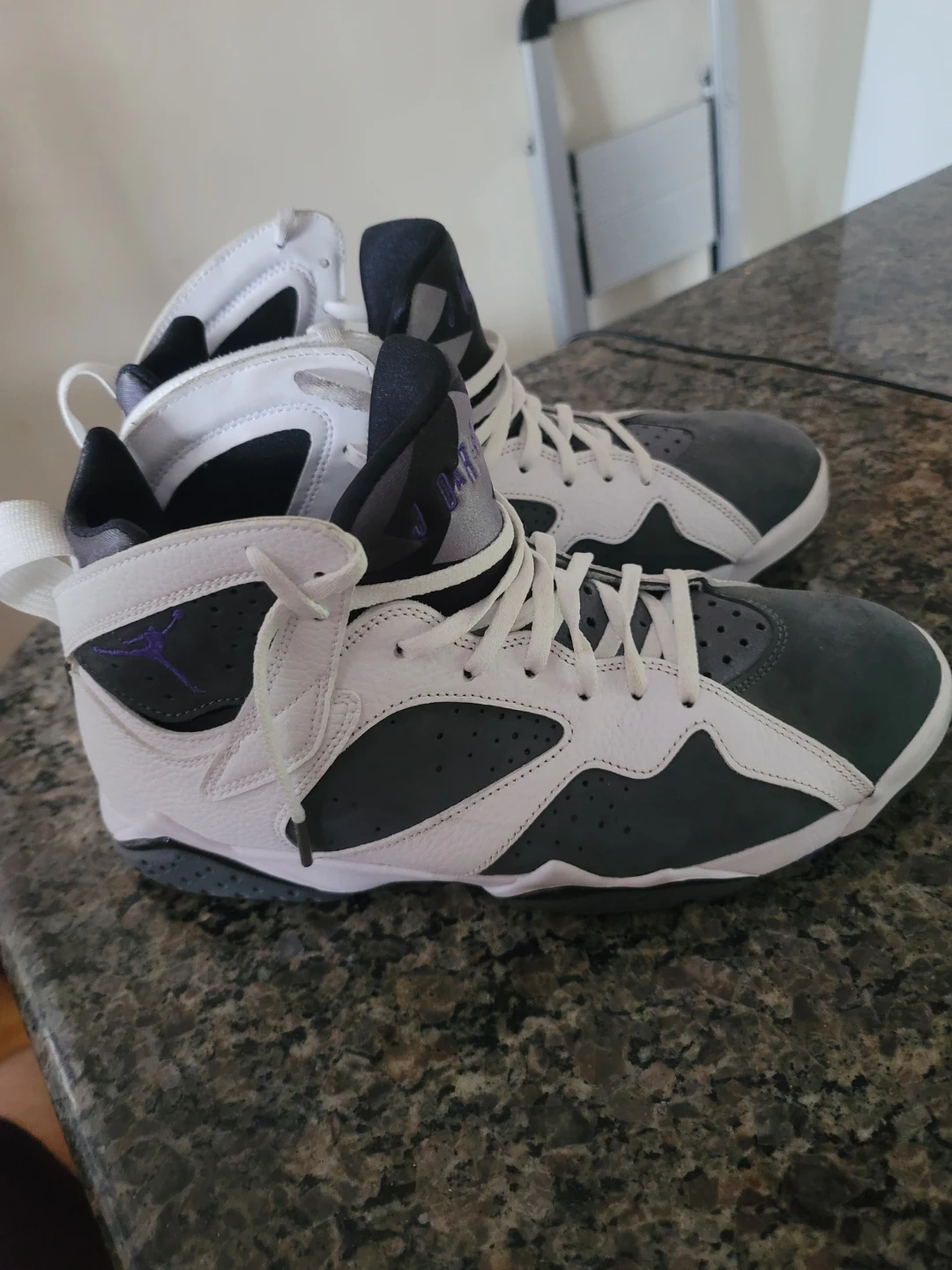 A pair of Air Jordan 7 Retro sneakers in the classic 'Flint' colourway. These high-top basketball shoes feature a mix of leather and nubuck with signature Jordan branding details. Authentic. Excellent for collectors or everyday wear! No Box. Pick up only