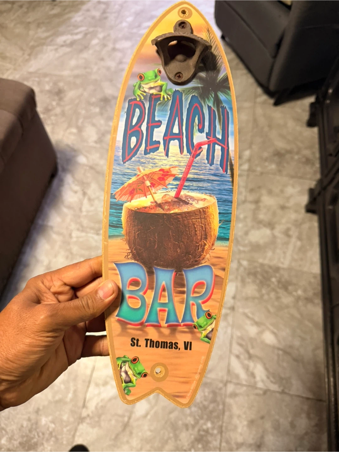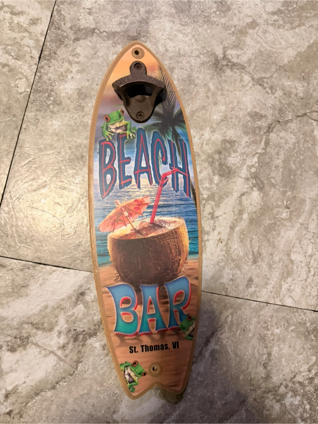 This wall mount bottle opener has a fun surfboard shape with tropical beach graphics. It features a metal opener and decorative design. Easy to mount, it's great for kitchens or bars!