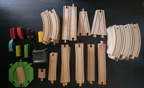 Large mixed lot of IKEA LILLABO wooden train track and accessories, compatible with most major wooden train systems (Brio, Melissa & Doug, Thomas-style wooden tracks). This lot includes a wide variety of straight tracks, curved tracks, switches, intersections, adapters, vehicles, and accessories, with a mix of wooden connectors and plastic connectors. What’s Included: Total pieces: 73 Straight track sections, Curved track sections (various radii), Switch / junction / specialty track pieces, Vehicles (wooden train cars), Plastic accessories (bridge/tunnel style pieces), Mixed wooden & plastic connector styles. All pieces are in great, clean condition. No cracks, breaks, or major damage. Light cosmetic wear only, consistent with gentle play. Perfect for expanding an existing LILLABO set or starting a large custom wooden train layout.