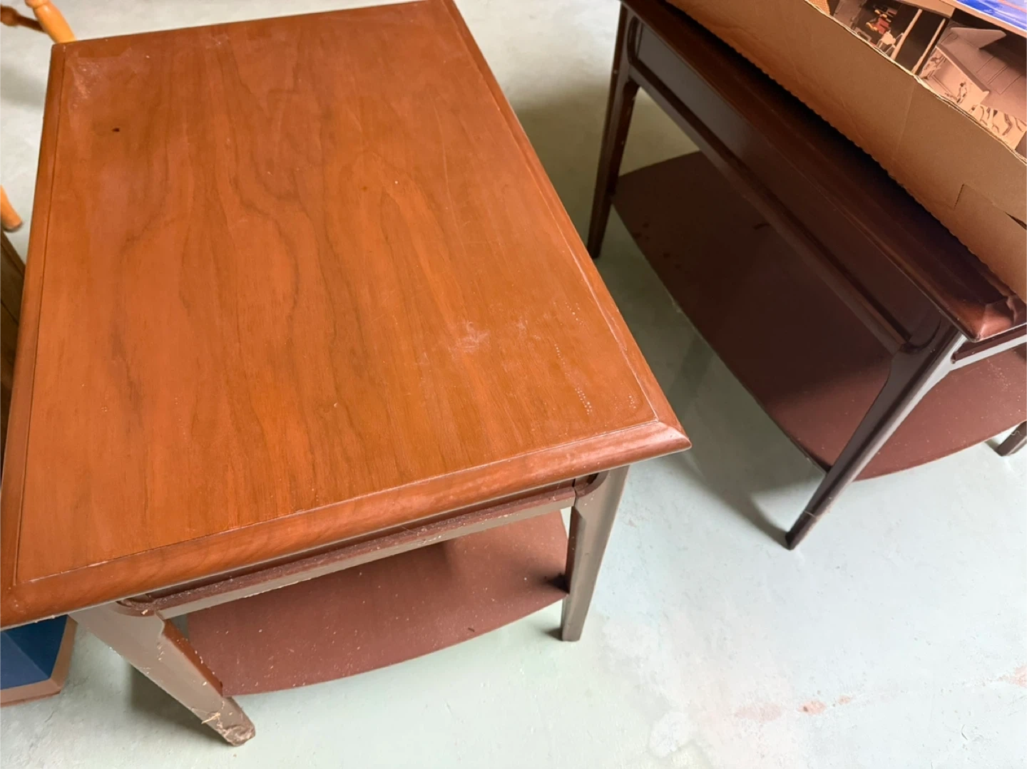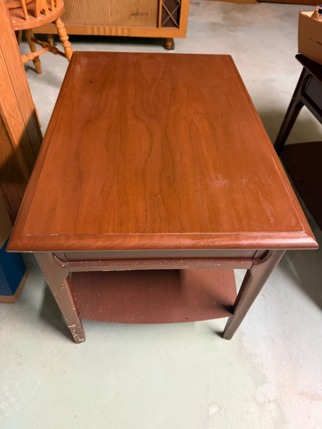 This end table is made of wood with a rich brown finish. It features a lower shelf for extra storage. The legs show some wear, but it's still a sturdy piece.