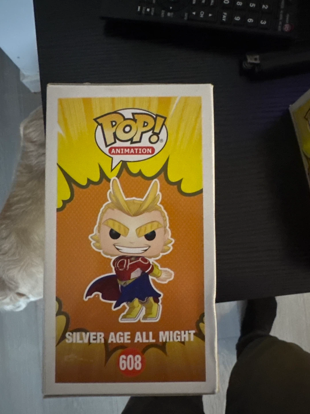 This is a Funko Pop! Animation vinyl figure of Silver Age All Might, number 608, from My Hero Academia. It comes in its original box. It's a collectible figure for fans of the series.