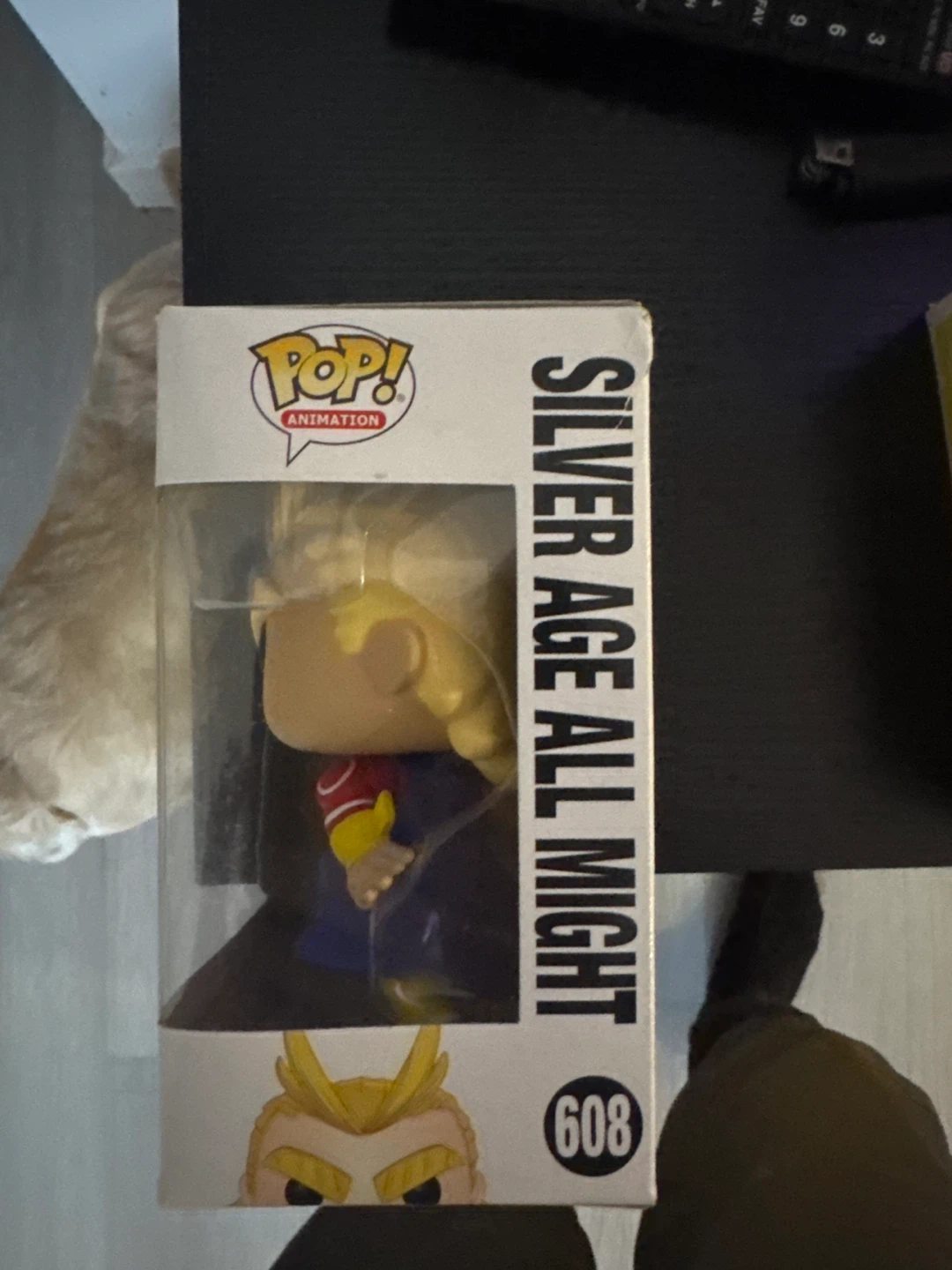 This is a Funko Pop! Animation vinyl figure of Silver Age All Might, number 608, from My Hero Academia. It comes in its original box. It's a collectible figure for fans of the series.