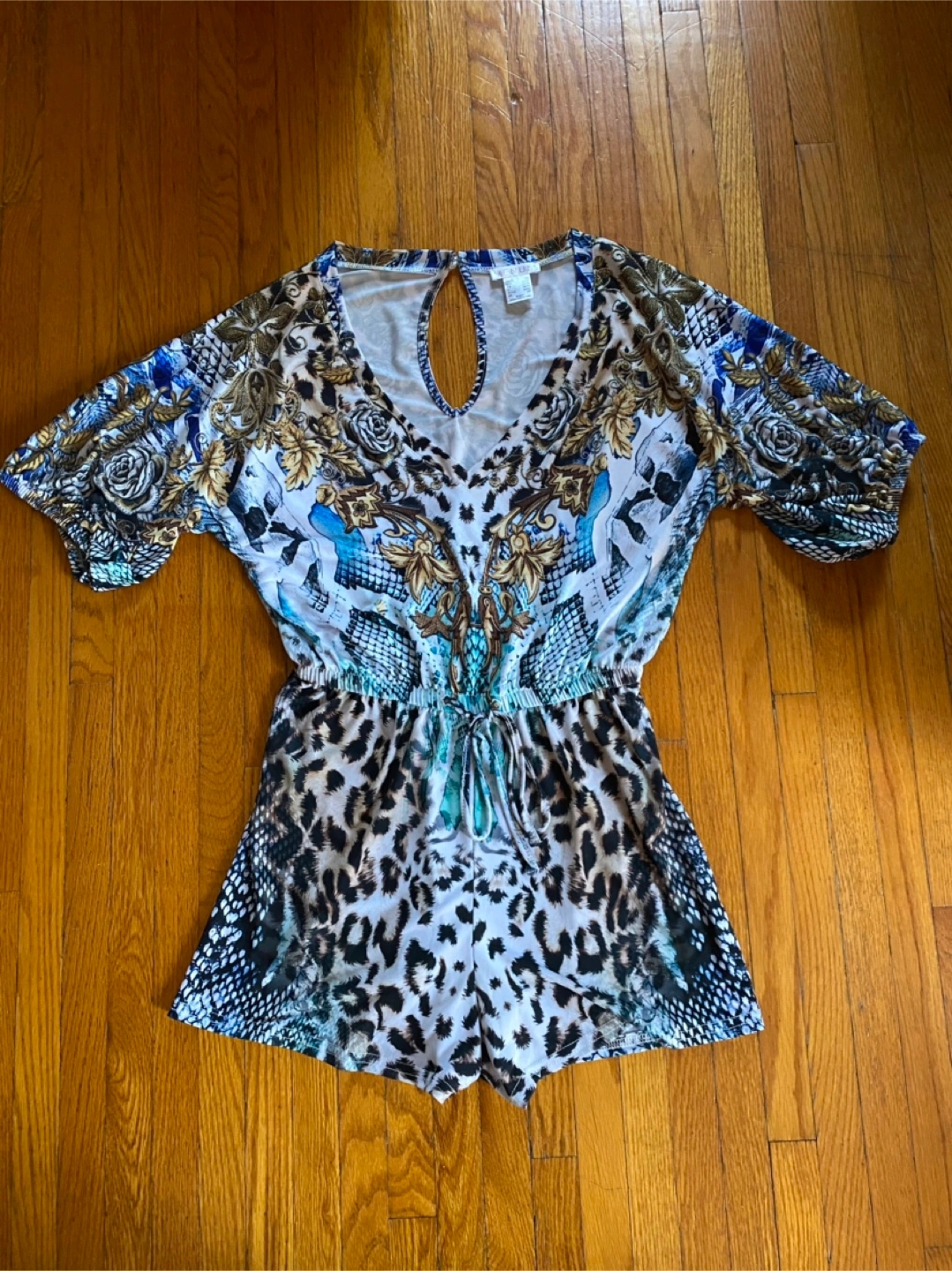 Selling a Venus romper in size XS (2). It features a unique design with floral, snakeskin, and leopard print patterns. Puffed sleeves and a drawstring waist. Perfect for a stylish and comfortable outfit! It has only been worn twice and is in excellent condition, like new.
