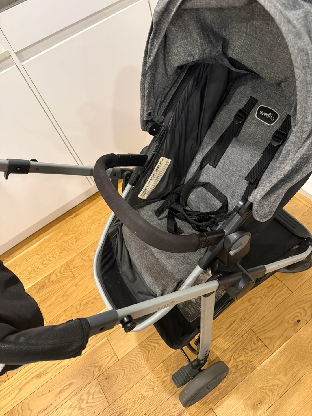 This is an Evenflo Omni Plus stroller in a grey colour. It features a reversible seat and an adjustable canopy. It's suitable for everyday use with your little one.It’s is good condition
