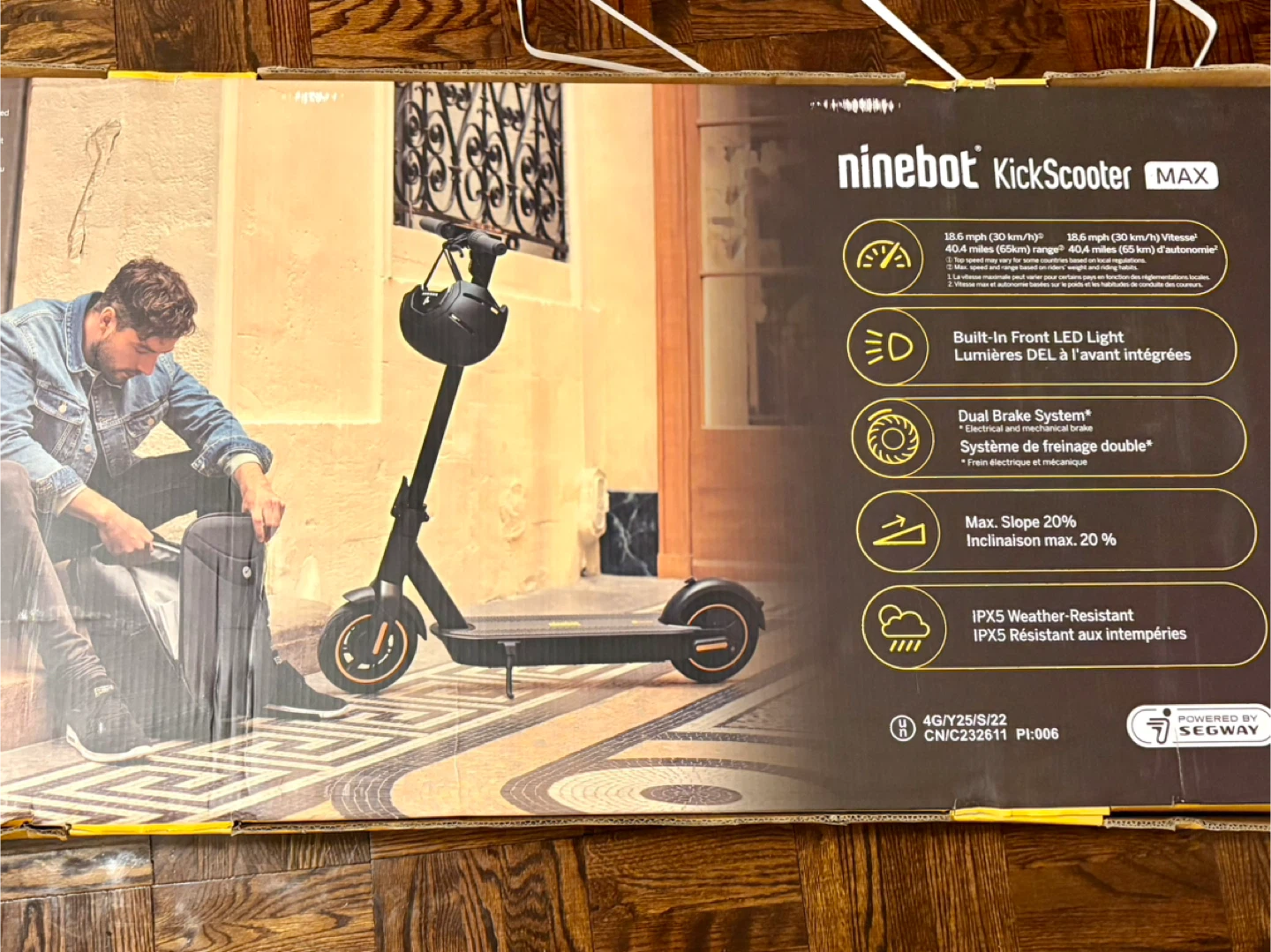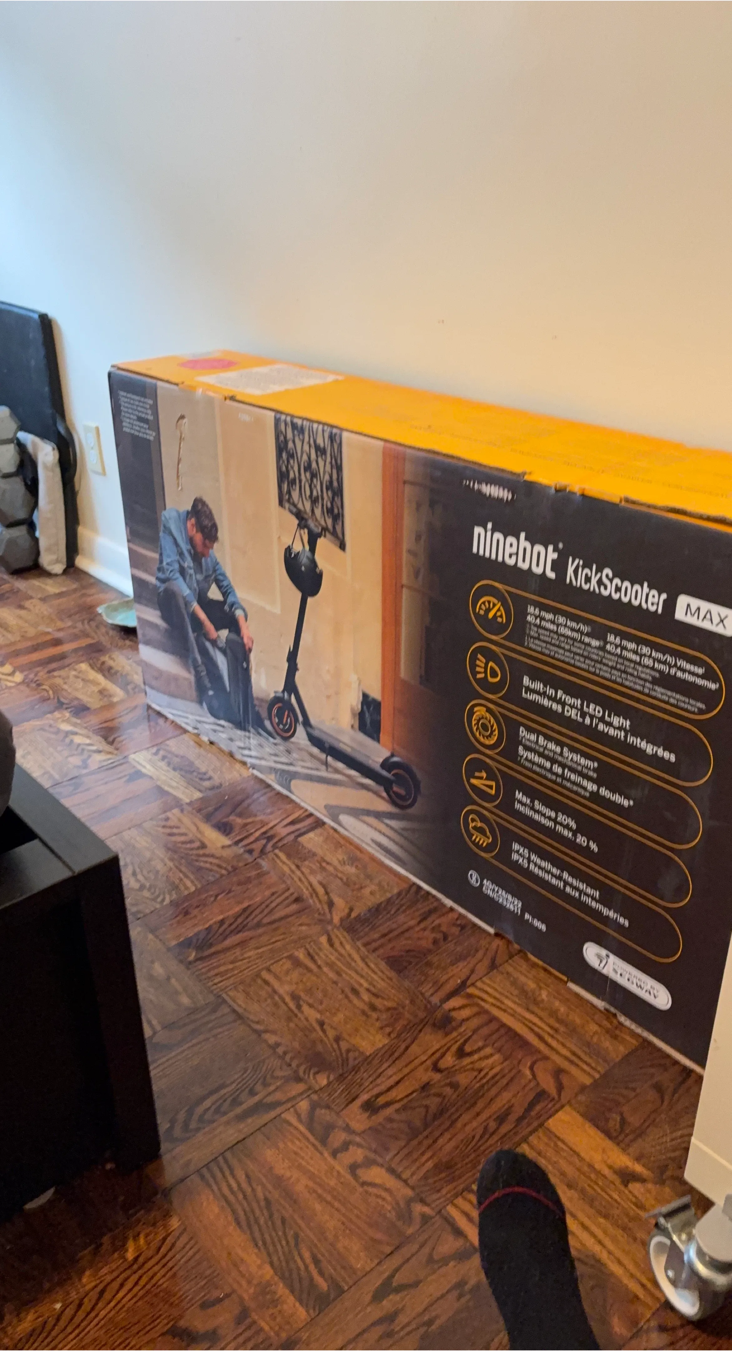 This Ninebot KickScooter MAX offers a max speed of 18.6 mph and a range of 40.4 miles. It's equipped with a built-in front LED light and a dual brake system. The scooter can handle a max slope of 20% and is IPX5 weather-resistant. Great for commuting!