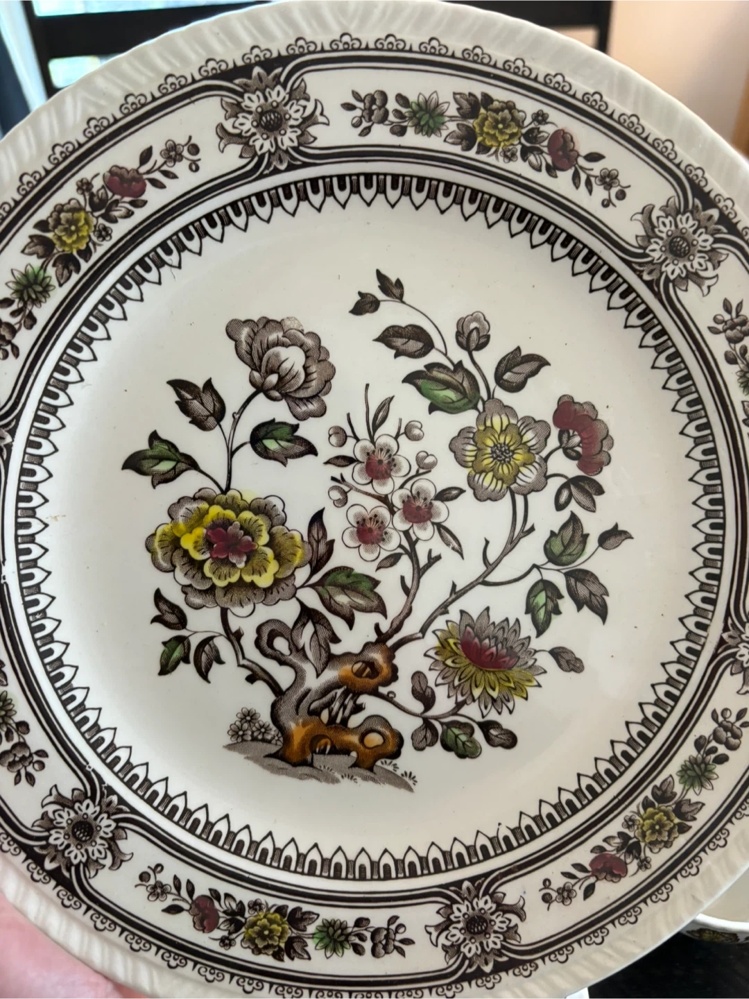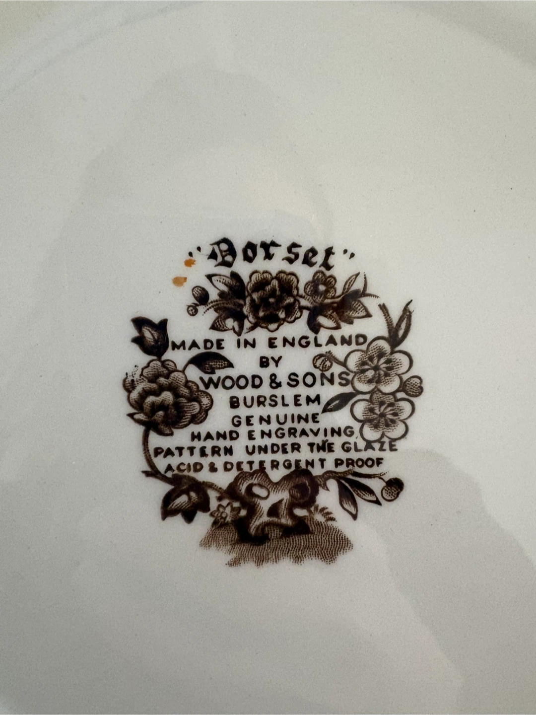 Vintage Wood & Sons Dorset pattern dinnerware set. Made in England with genuine hand engraving. Features a beautiful floral design that's acid and detergent proof. This classic set includes cups, saucers, bowls, and plates.