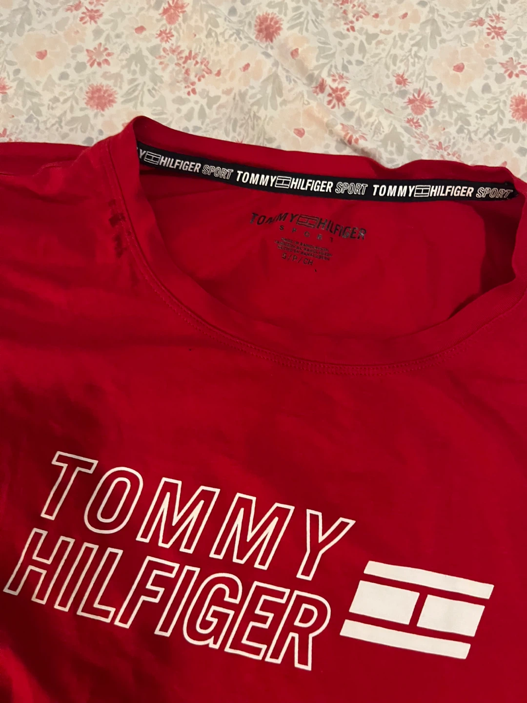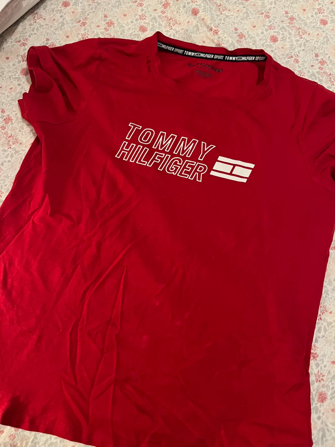 Tommy Hilfiger Sport red T-shirt in size small! The shirt is in great condition and features the Tommy Hilfiger logo on the front. Perfect for workouts or casual wear!