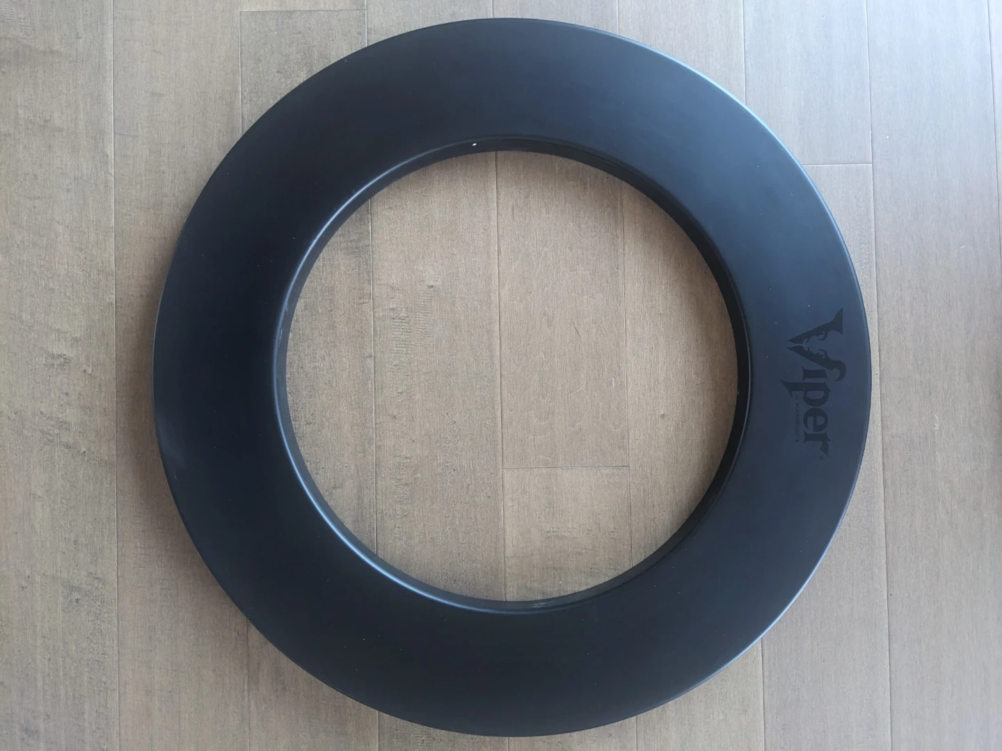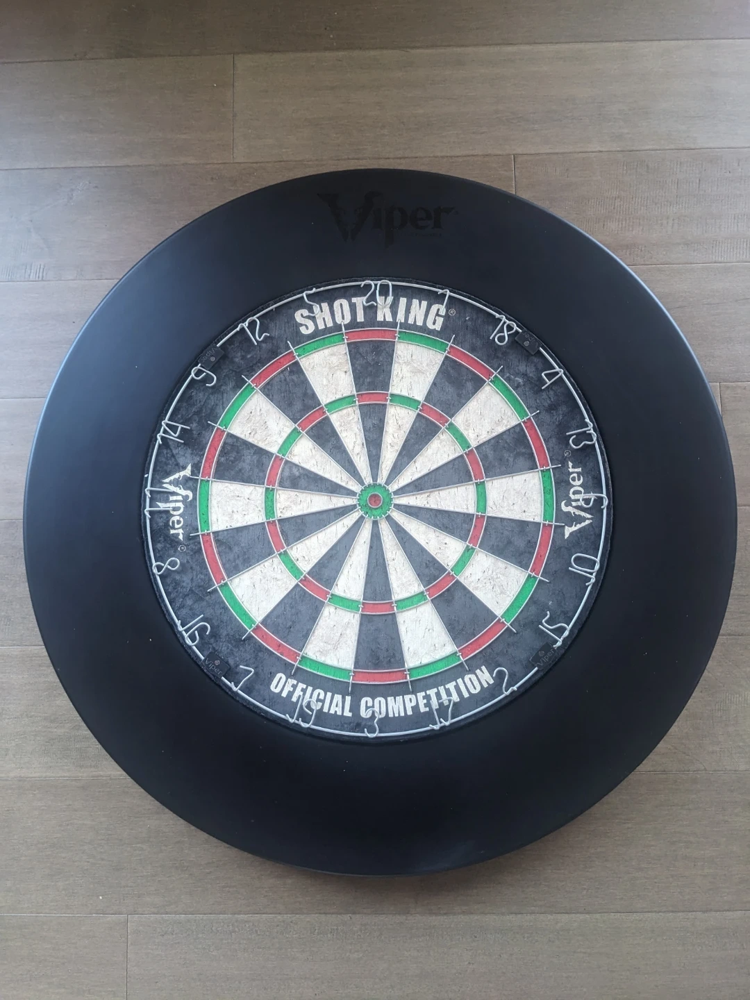 This Viper dartboard is designed for official competition. It comes with a black protector ring to help prevent wall damage. Board displays "SHOT KING" and "OFFICIAL COMPETITION" text.