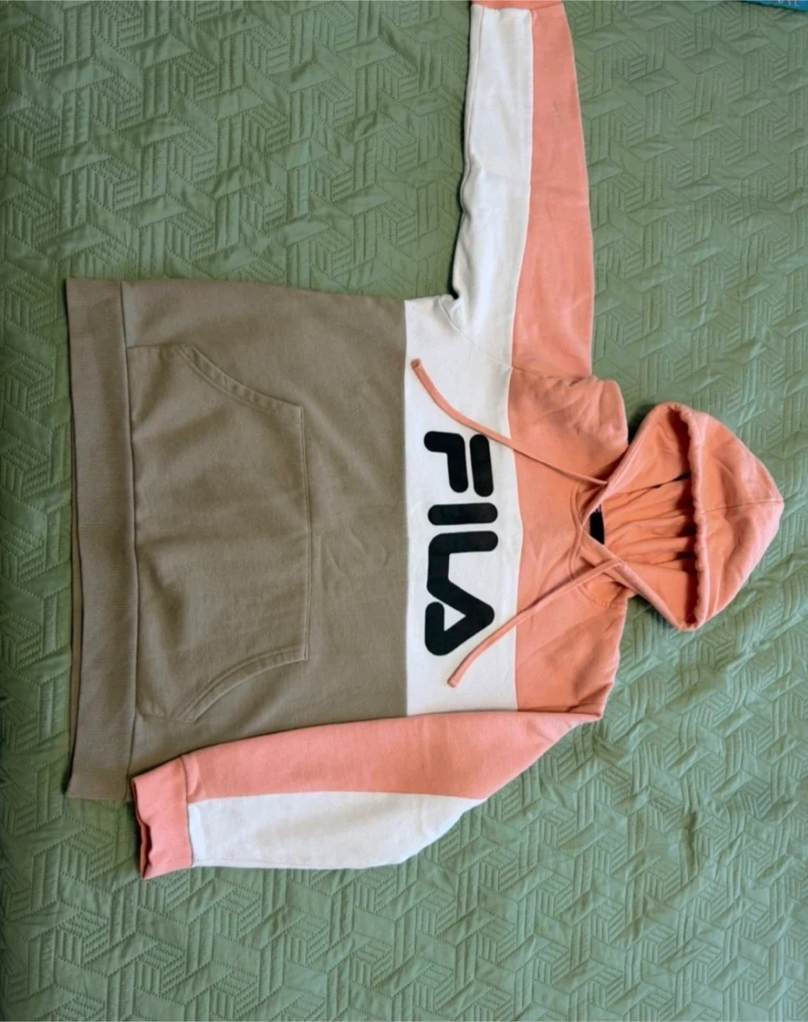 Fila colour block hoodie. Features a front pouch pocket and adjustable drawstring hood. This hoodie has contrasting tan, white, and coral panels with the Fila logo across the chest.