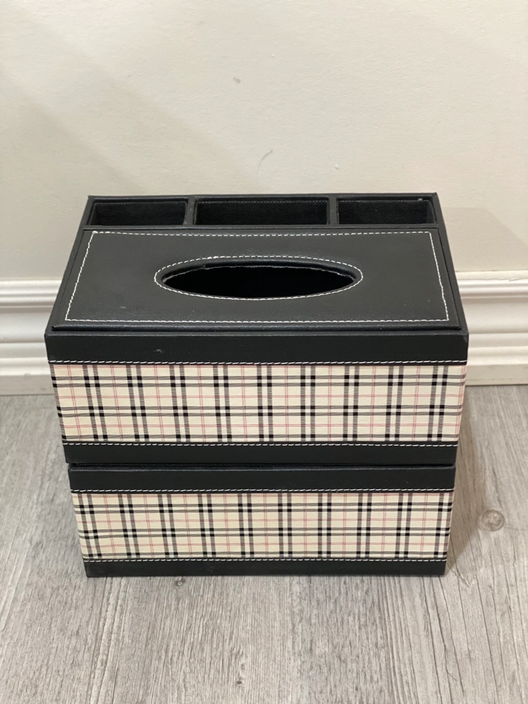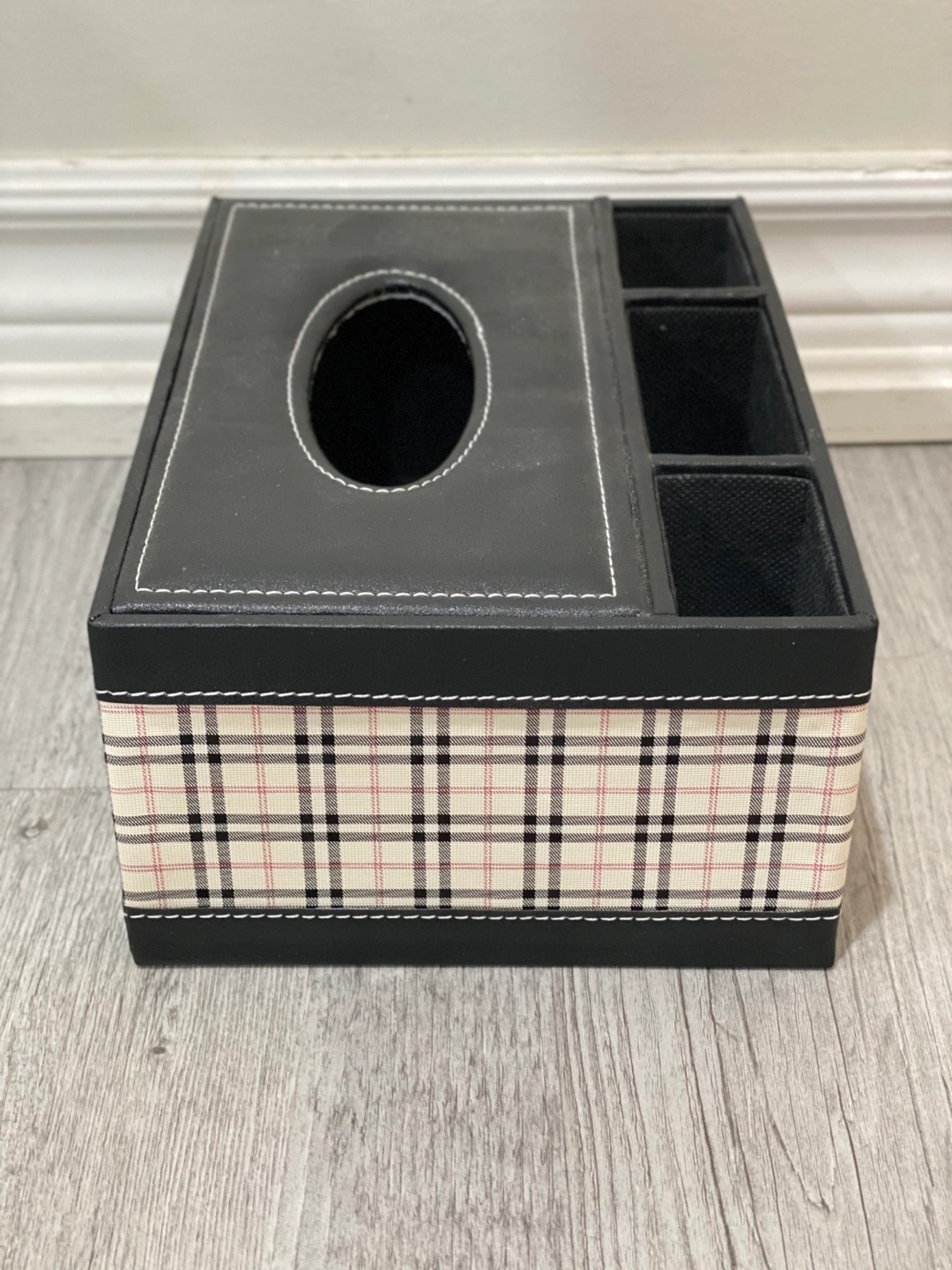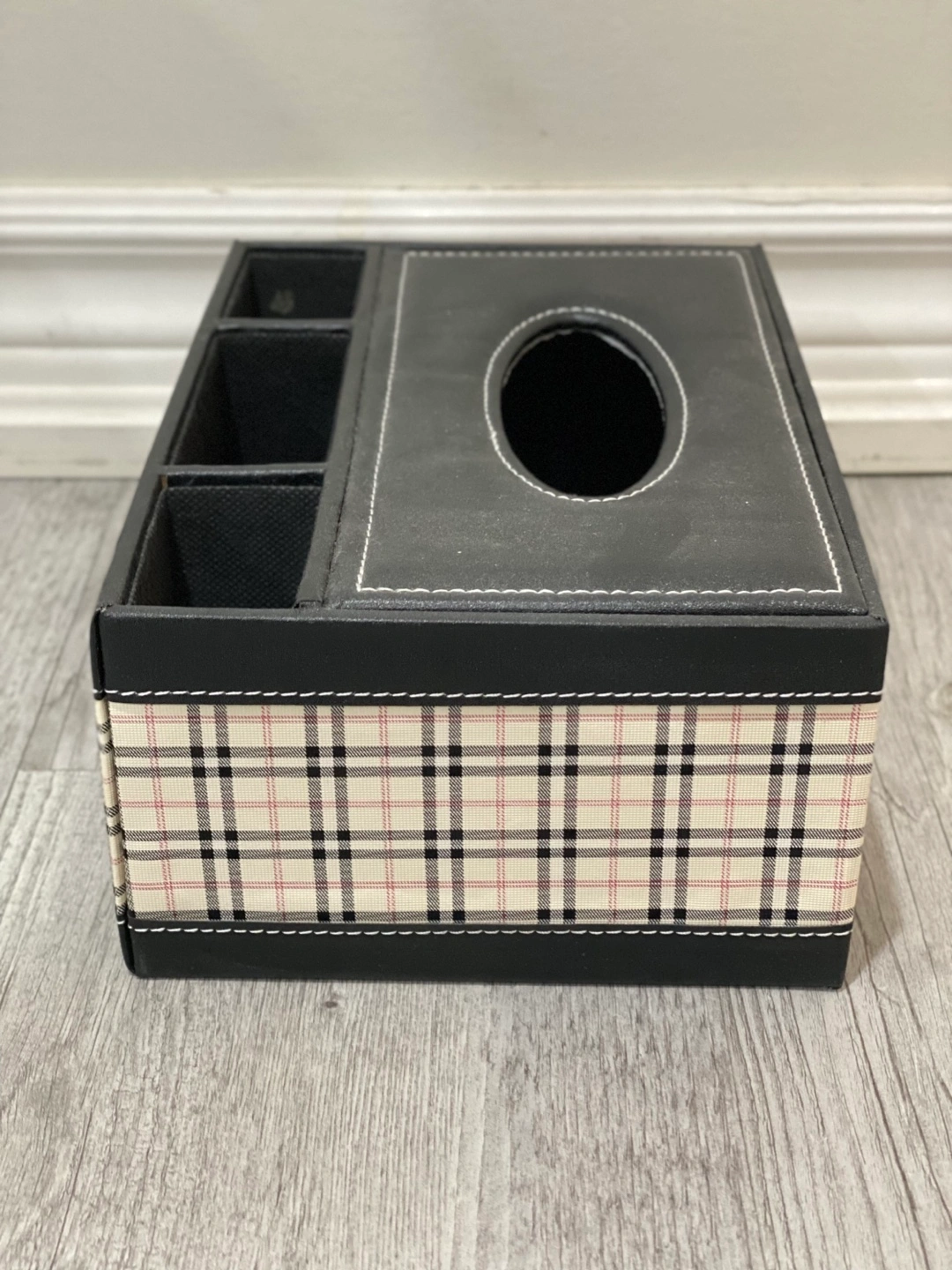 Black tissue box with storage compartments. The lid flips open to reveal a tissue holder and compartments for organizing small items. Black with a plaid design.