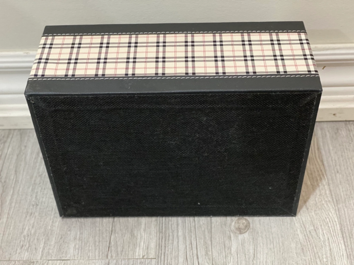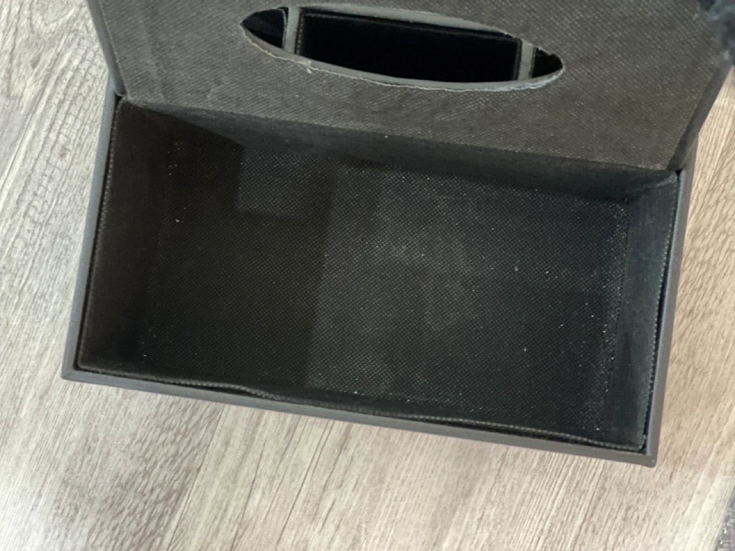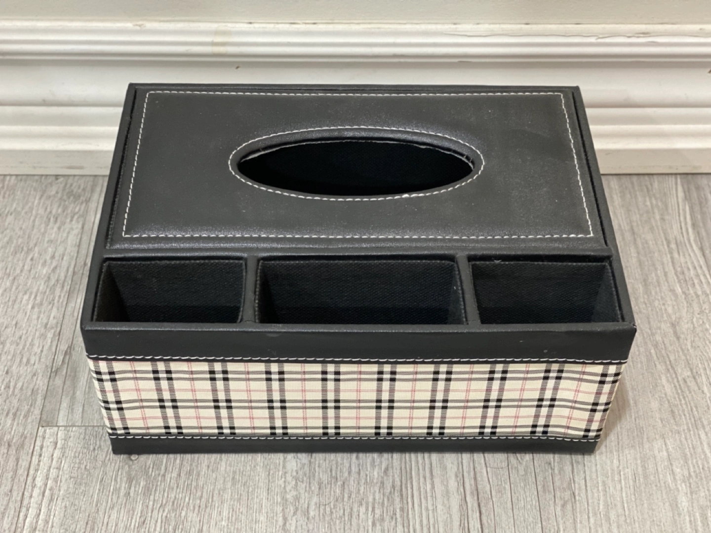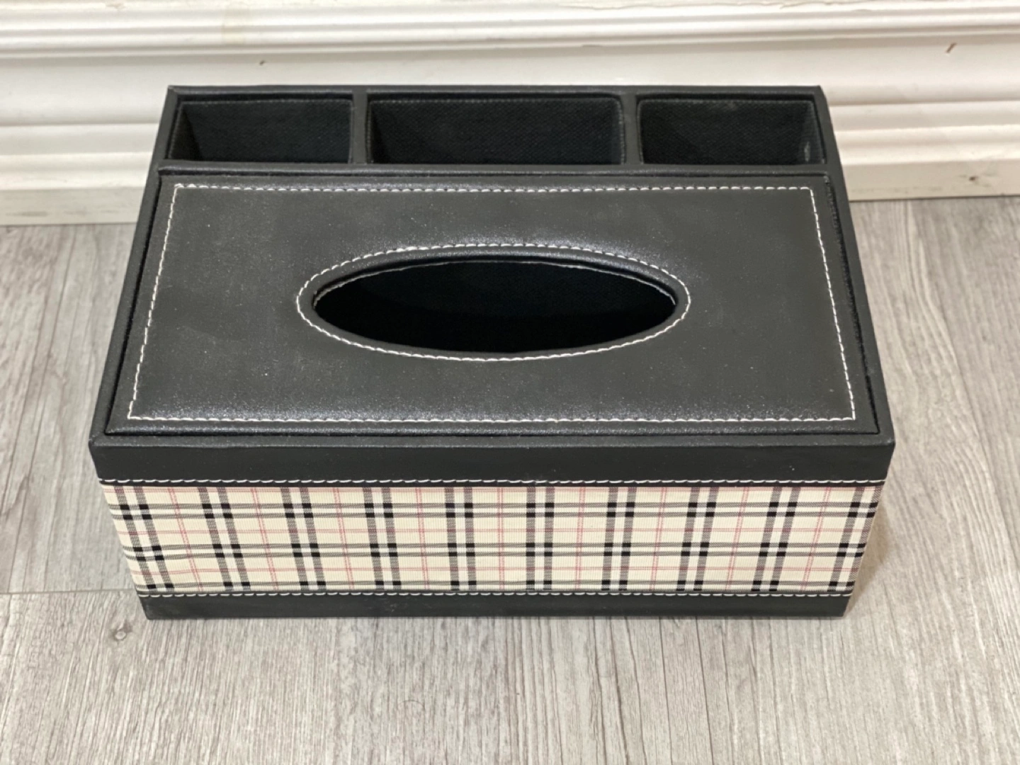 Black tissue box with storage compartments. The lid flips open to reveal a tissue holder and compartments for organizing small items. Black with a plaid design.