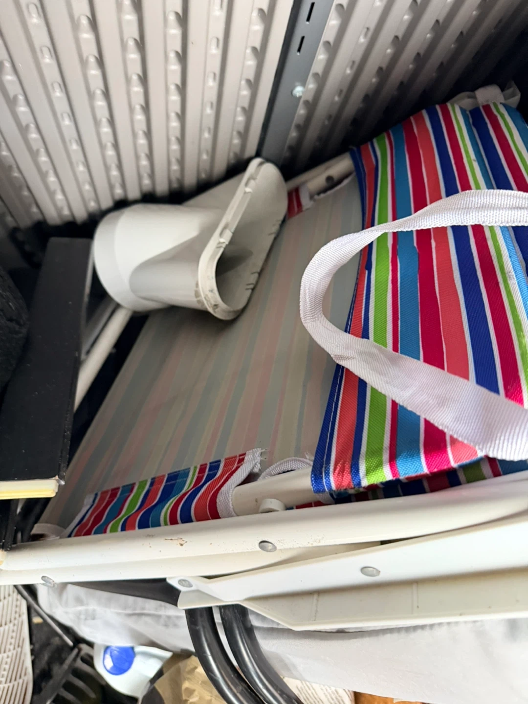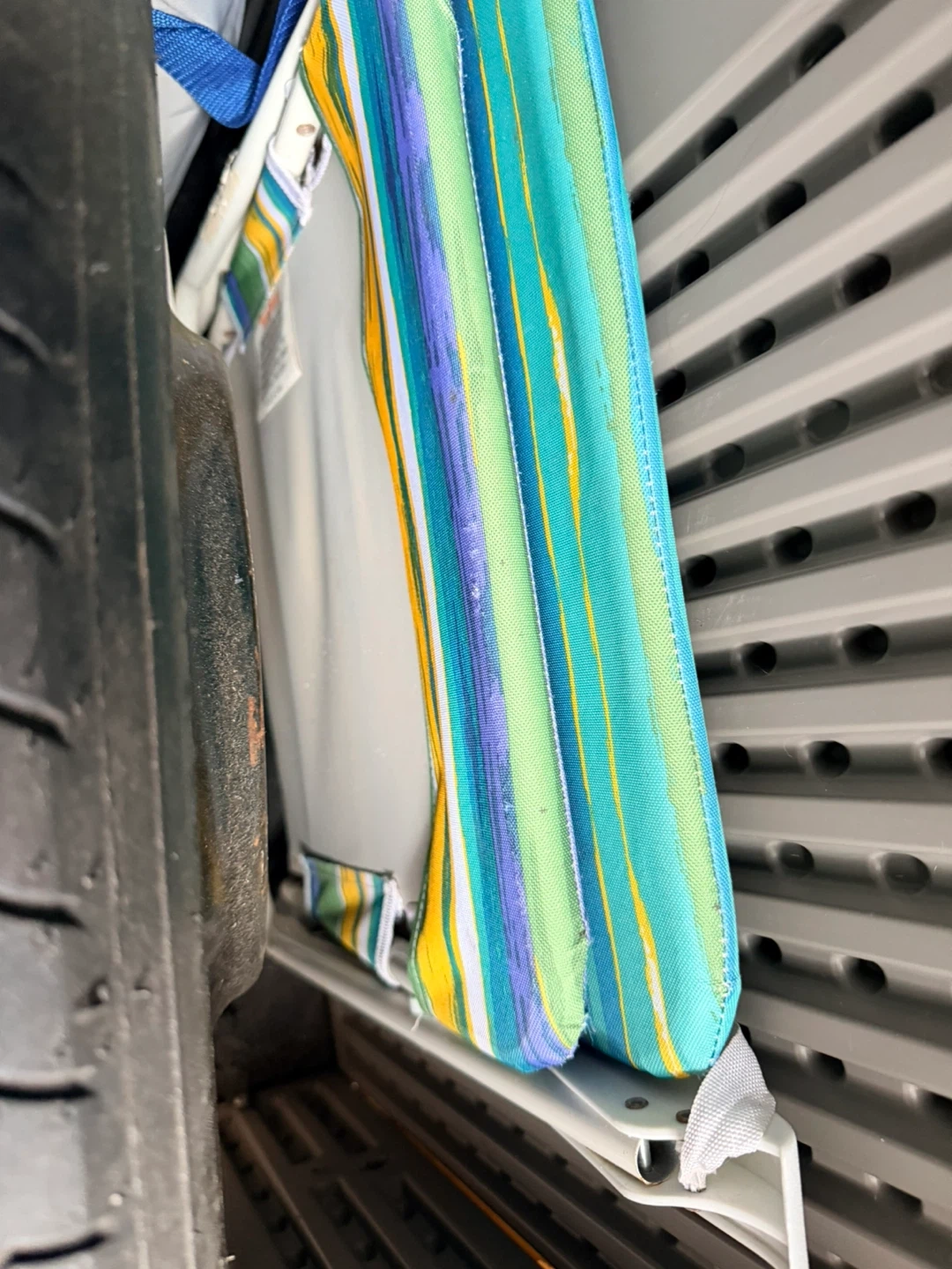 This striped folding camp chair is portable and easy to set up. It has a durable fabric seat and back with a metal frame. Folds flat for convenient storage.