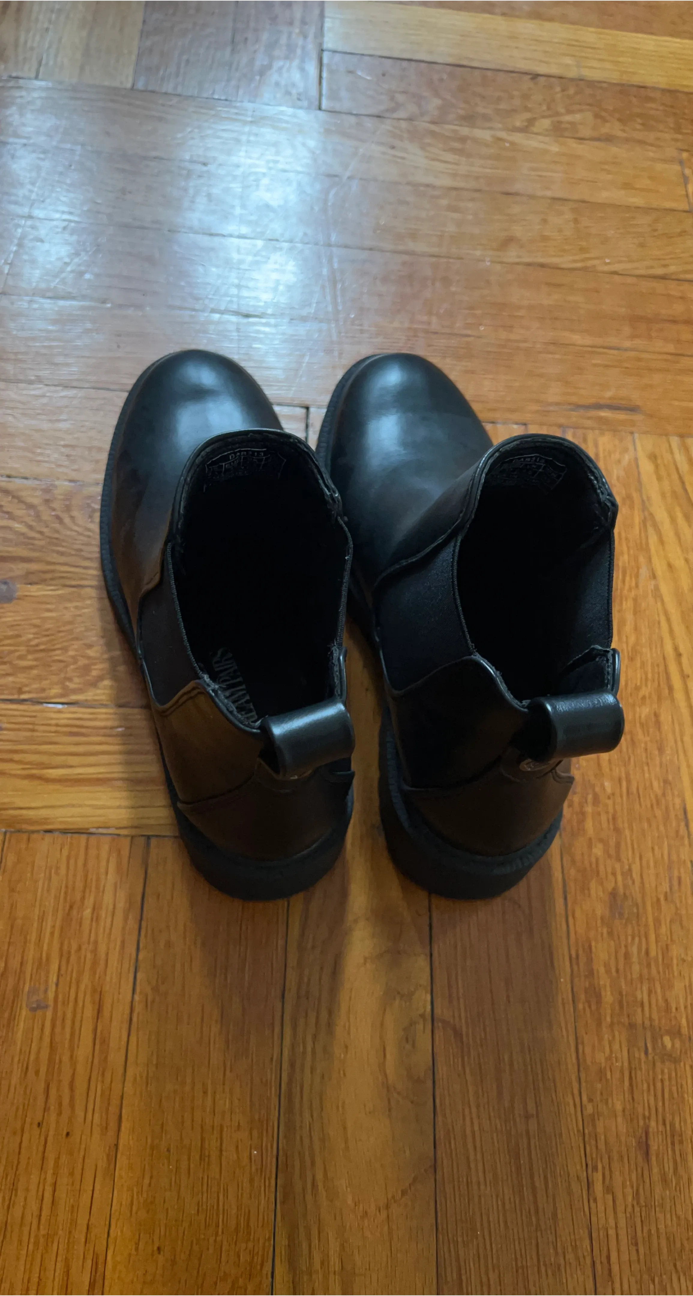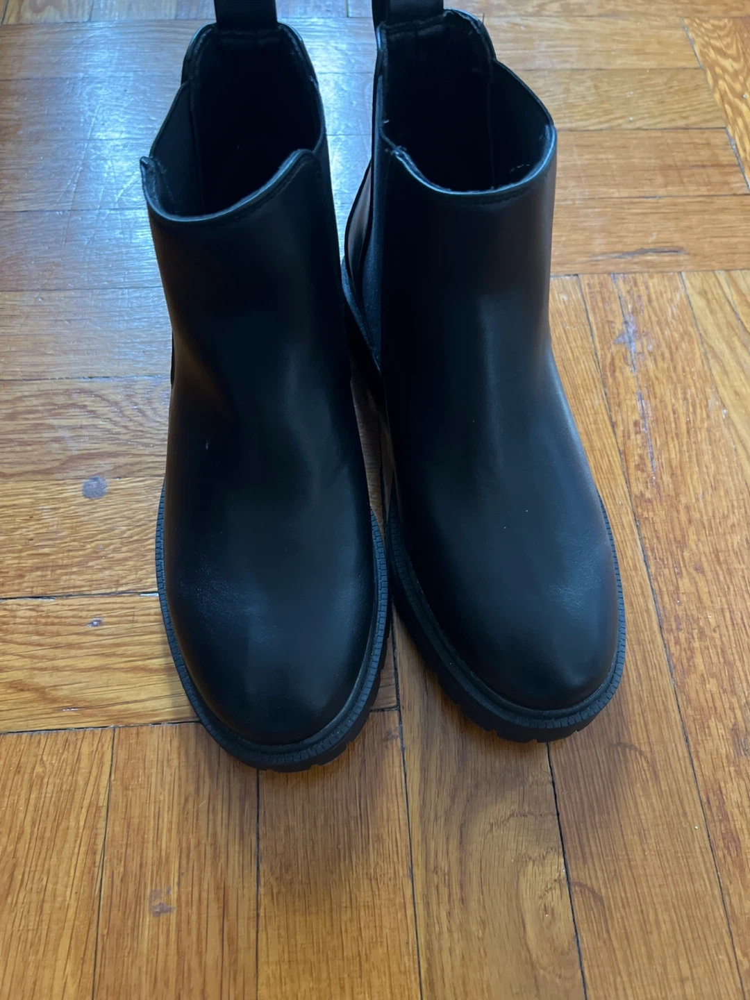 Classic black Chelsea boots. These feature a faux leather upper and elastic side panels for an easy fit. The lug sole provides good traction. Size is 6.5
