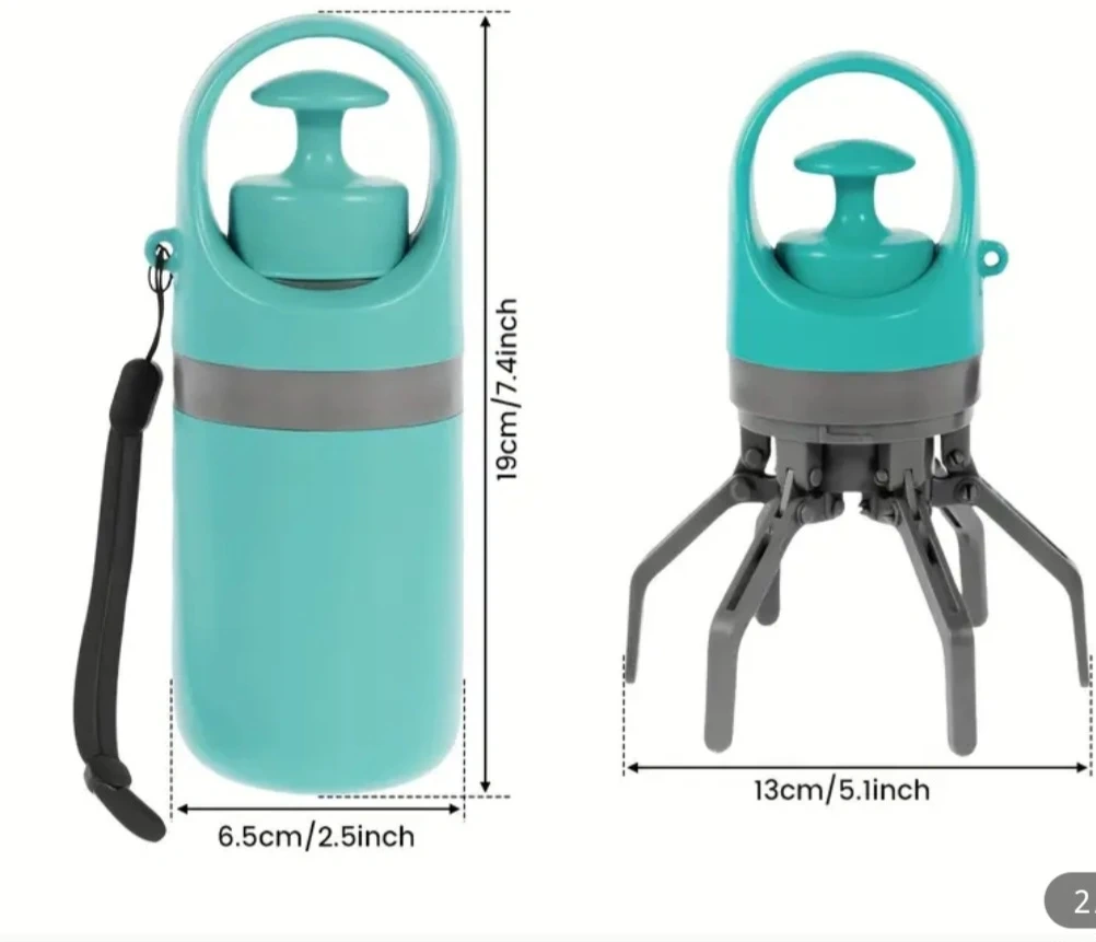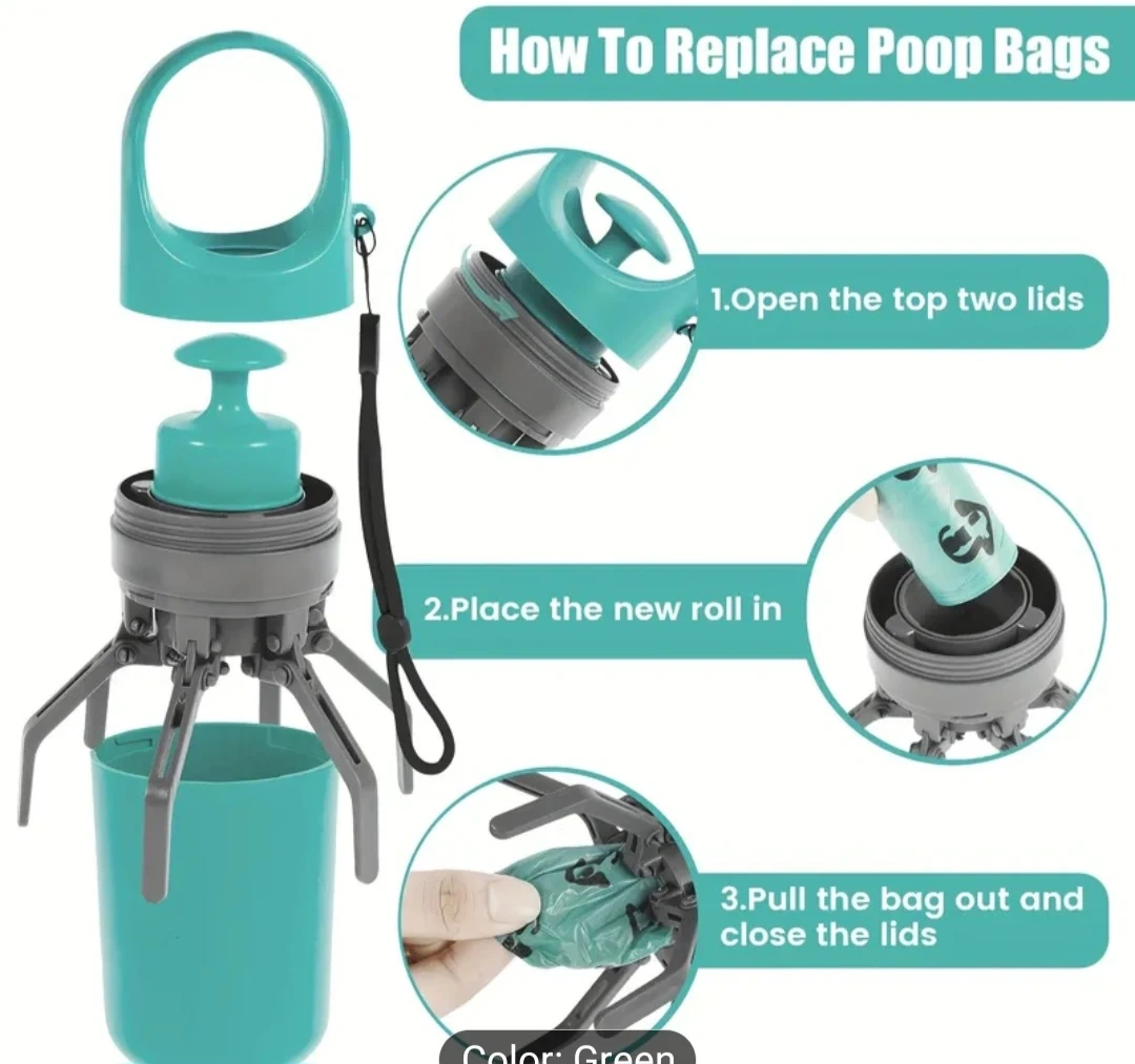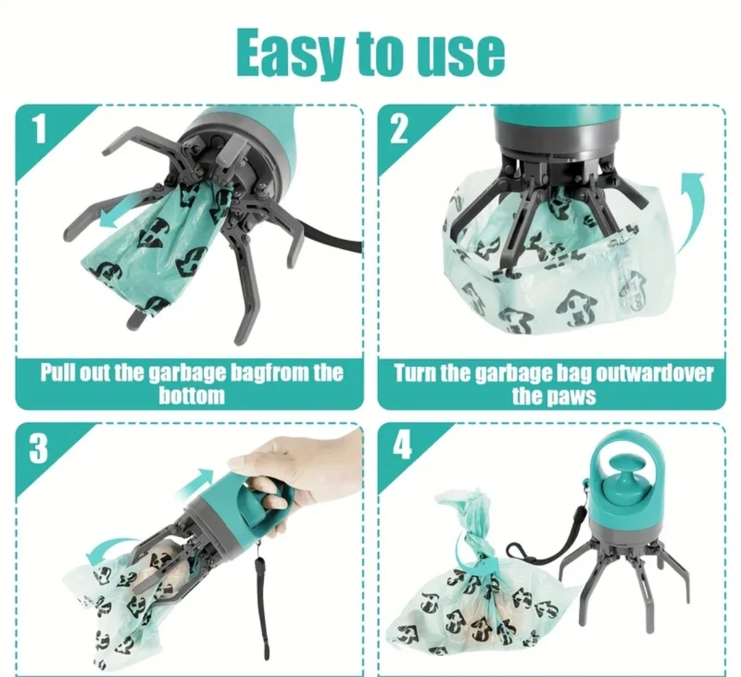 This is a handy dog poop bag dispenser with a built-in claw. It's easy to use, just pull out a bag from the bottom and turn the bag outward over the paws. The dispenser holds a roll of bags and has a strap for easy carrying. It's a practical tool for dog owners!