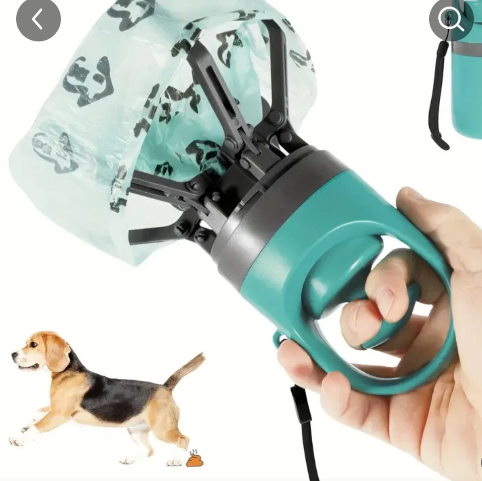 This is a handy dog poop bag dispenser with a built-in claw. It's easy to use, just pull out a bag from the bottom and turn the bag outward over the paws. The dispenser holds a roll of bags and has a strap for easy carrying. It's a practical tool for dog owners!