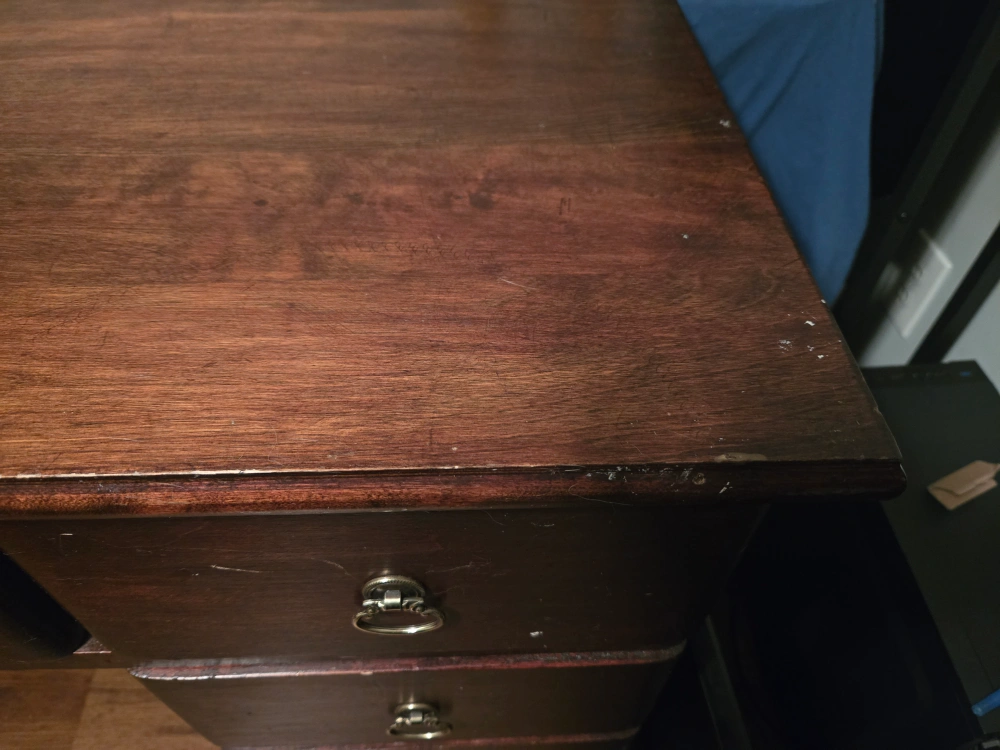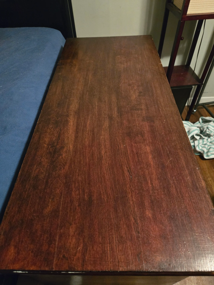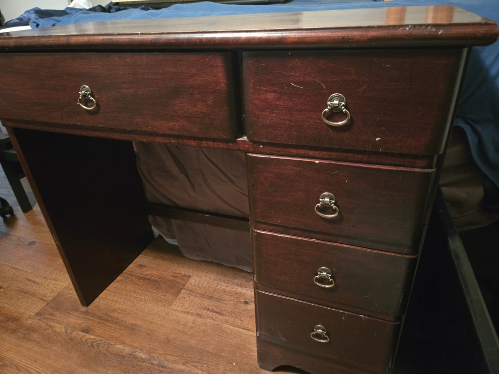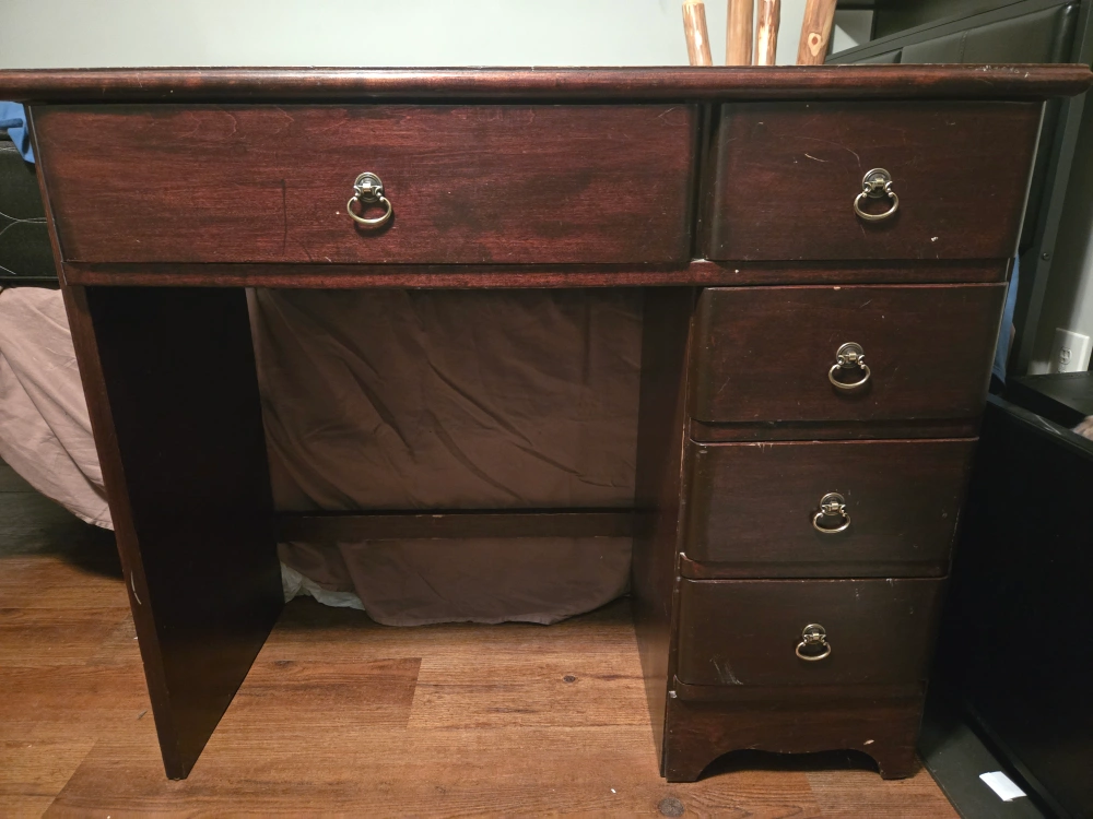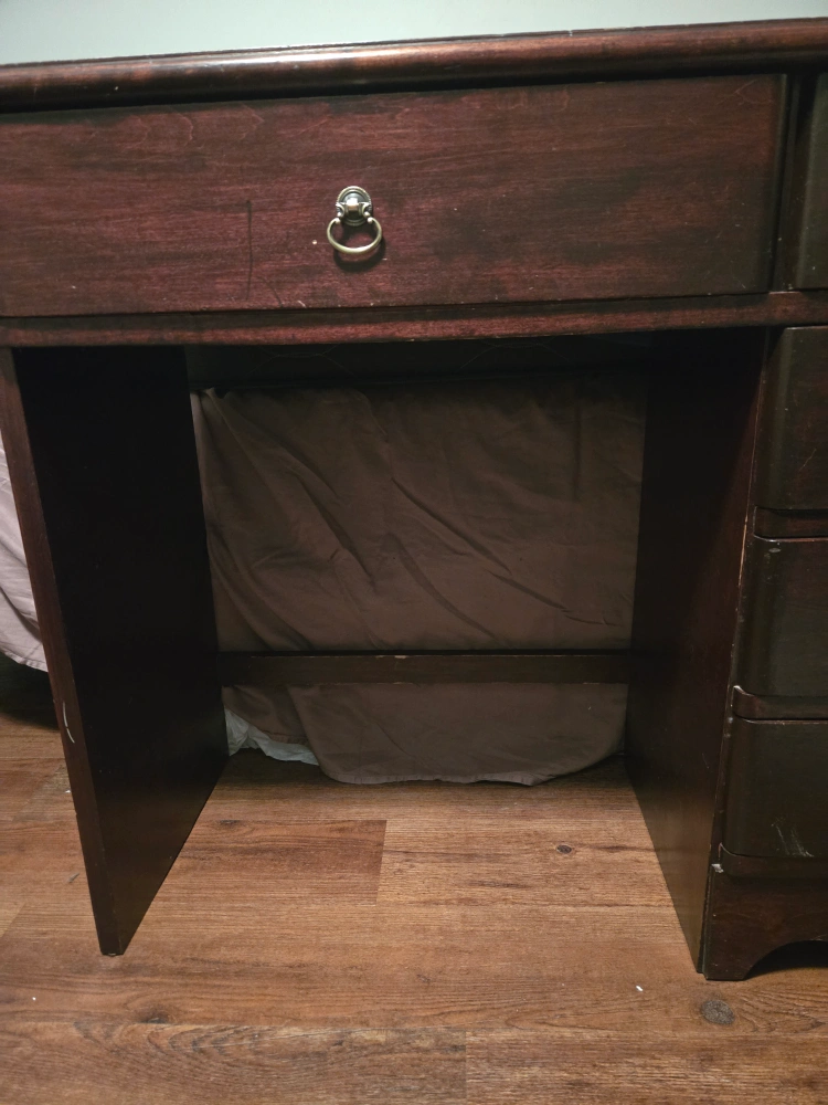 This is a dark wood desk with several drawers for storage. It's a classic design suitable for a home office or bedroom. The wood has a nice grain pattern.