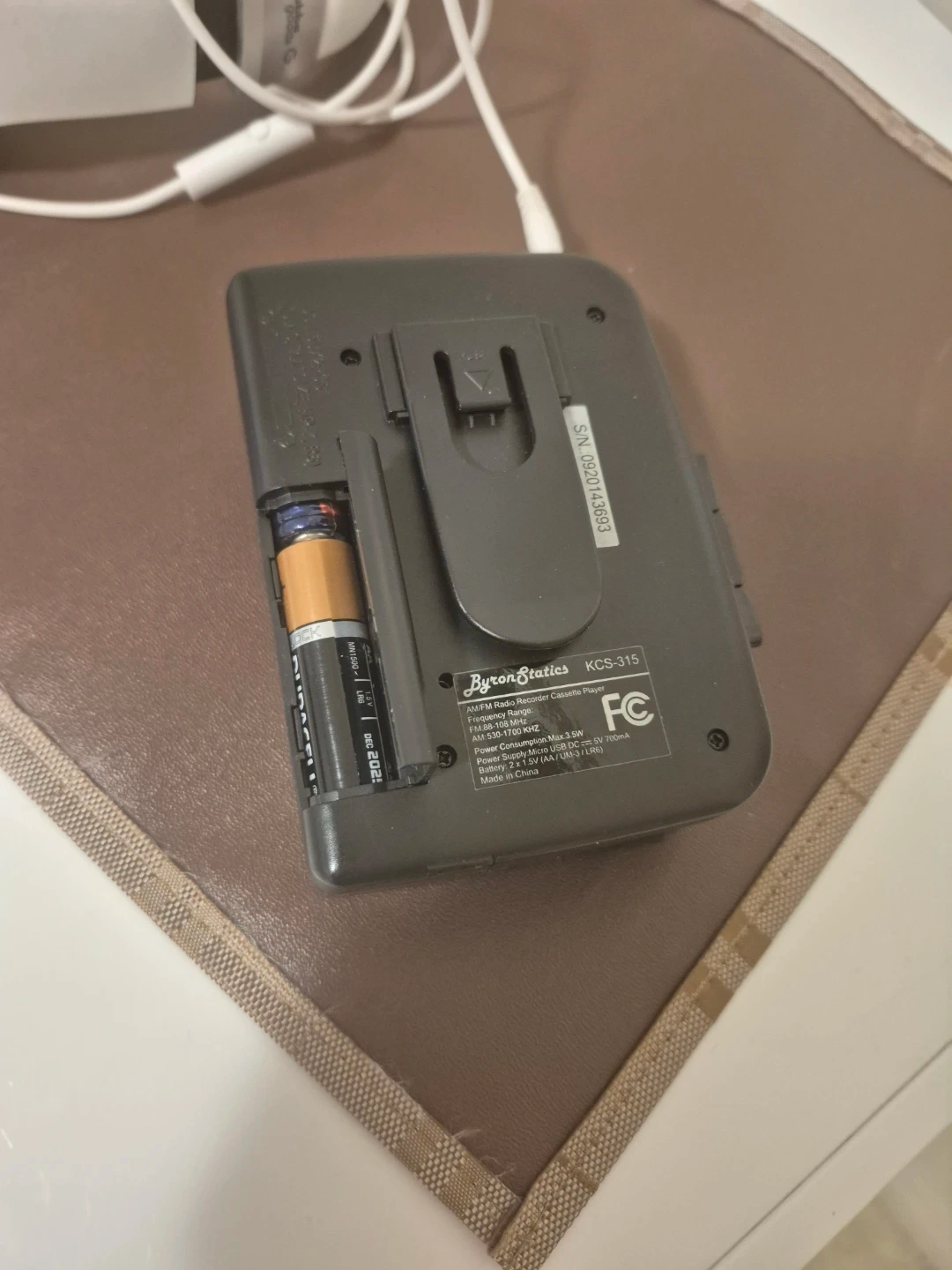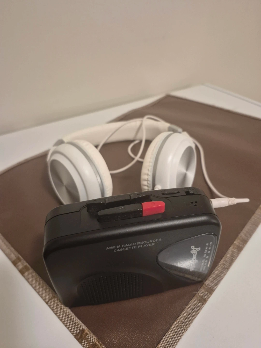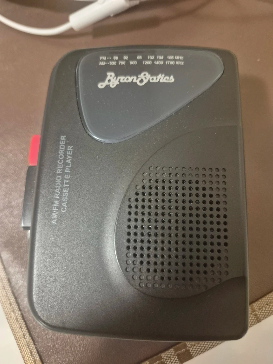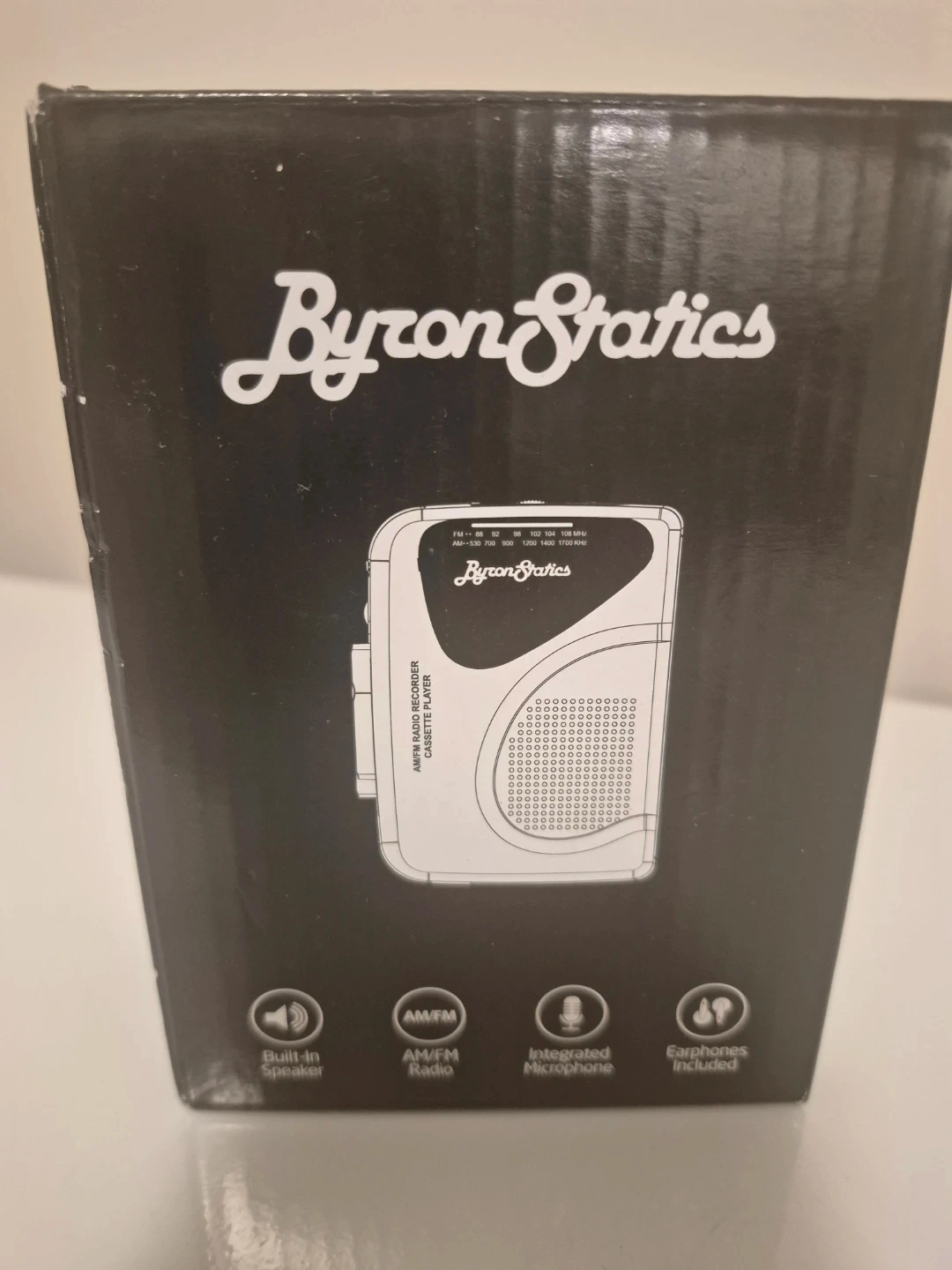 Byron Statics KCS-315 AM/FM radio cassette player and recorder. Includes built-in speaker and integrated microphone. Powered by 2 AA batteries (Included)! Headphones are also included. Curbside pickup M-Sun 5-9pm!