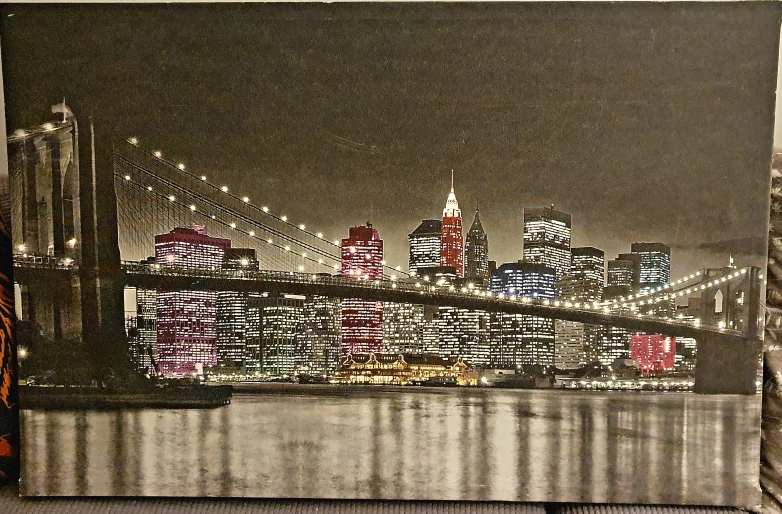 A beautiful canvas print featuring the New York City skyline at night! The print showcases the Brooklyn Bridge and the city's iconic buildings with their lights reflecting on the water.