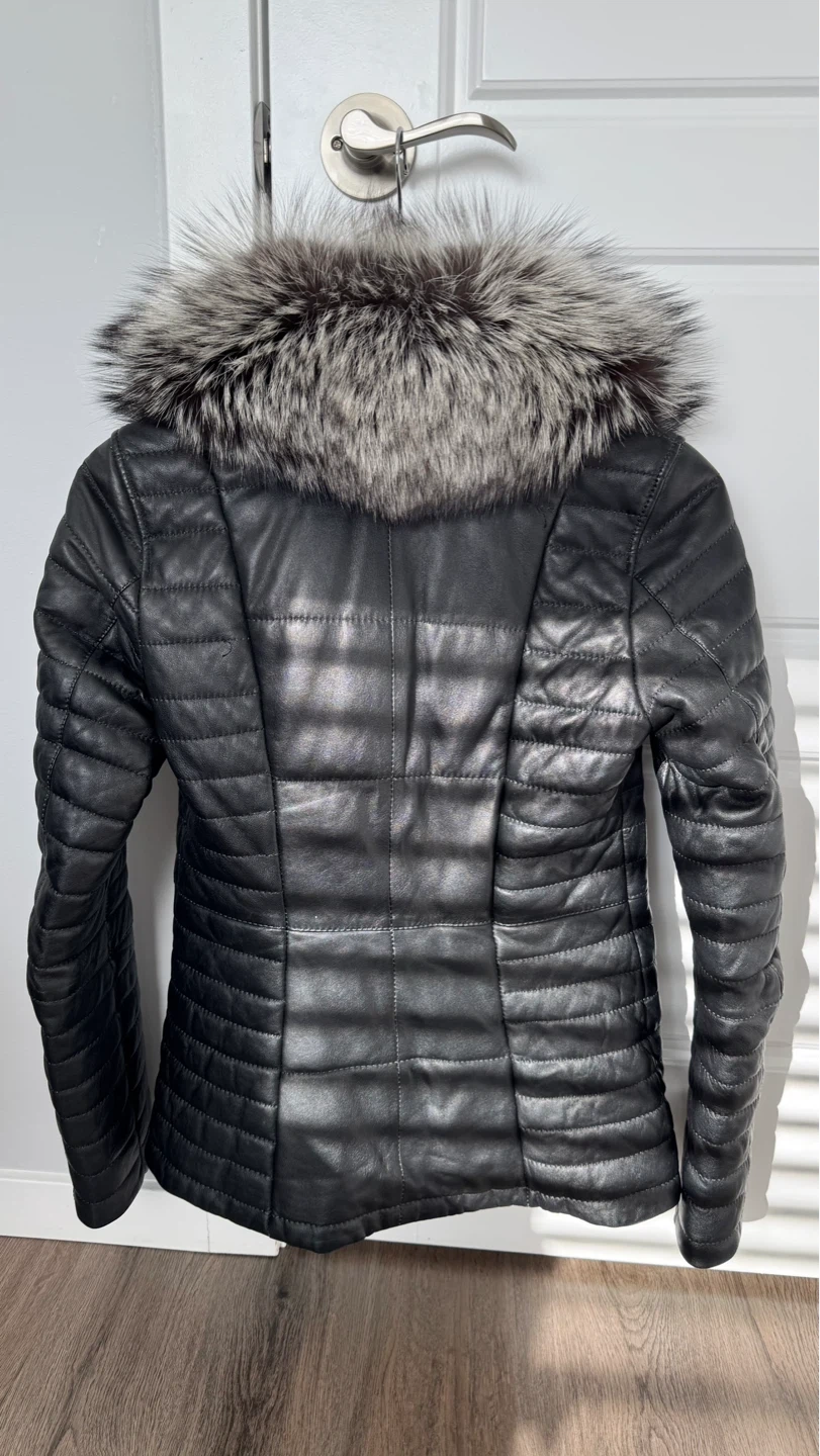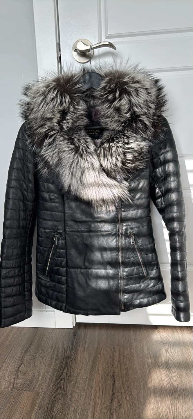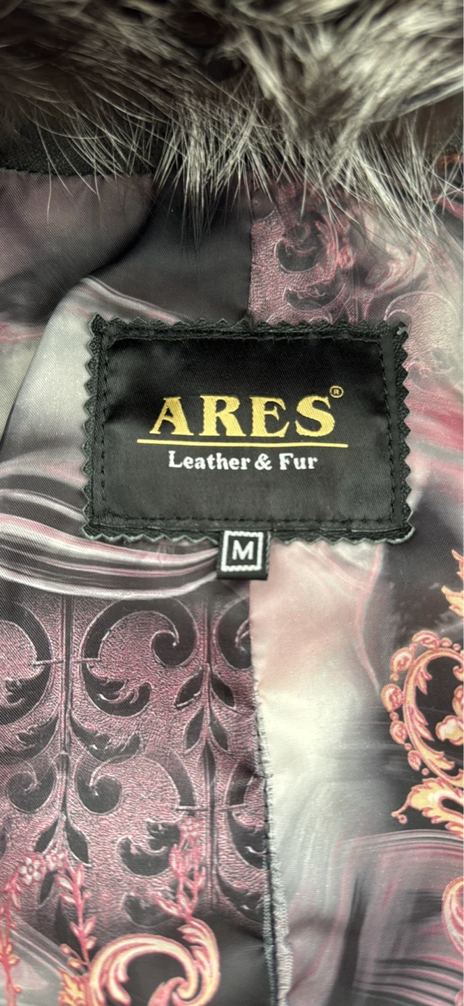 Black leather jacket from ARES with a fur-lined collar, no hood. Size medium. It's a stylish autumn/spring coat.