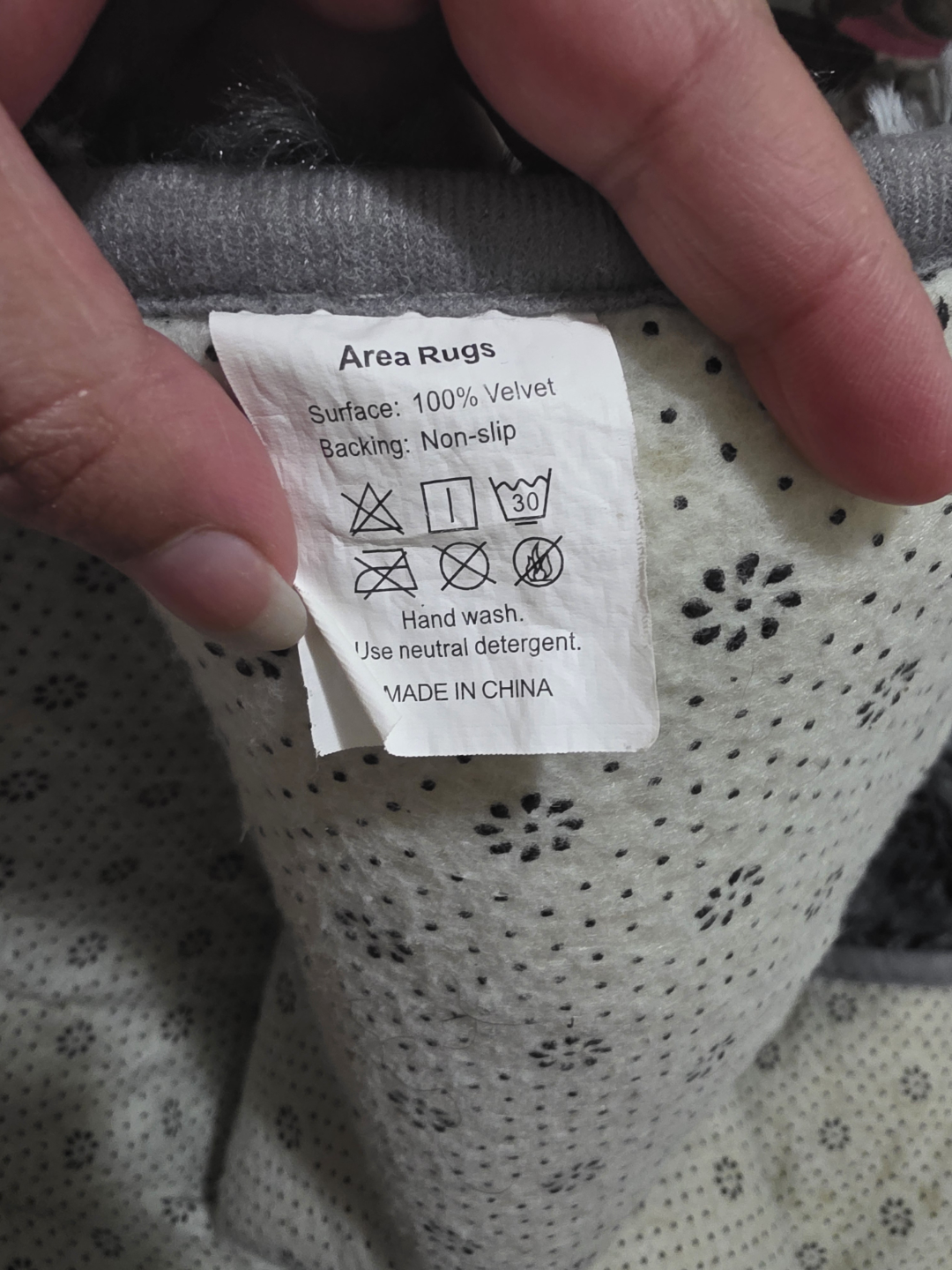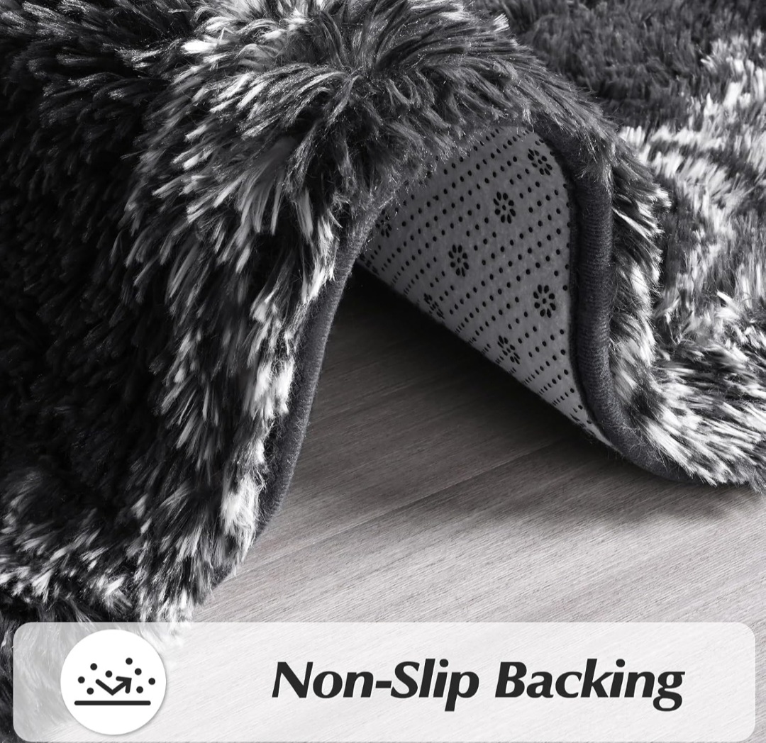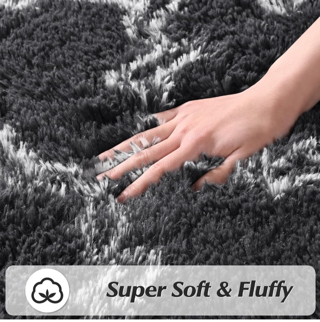 Super soft and fluffy area rug. Features a grey and white pattern. Non-slip backing. Made in China. Hand wash only.