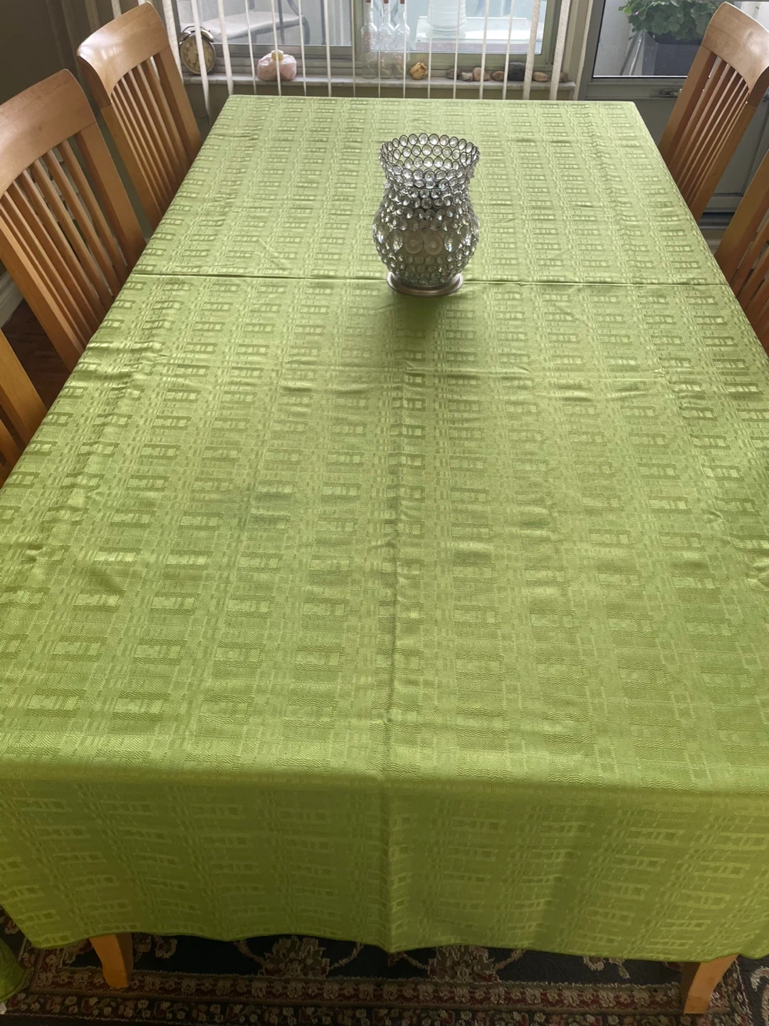 This is a light green tablecloth with a subtle textured pattern. It's generously sized to fit most standard dining tables. Add a touch of colour to your next meal!