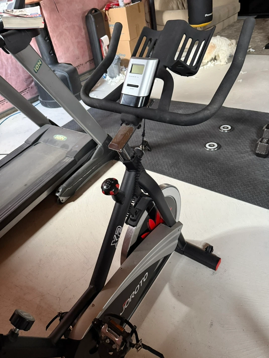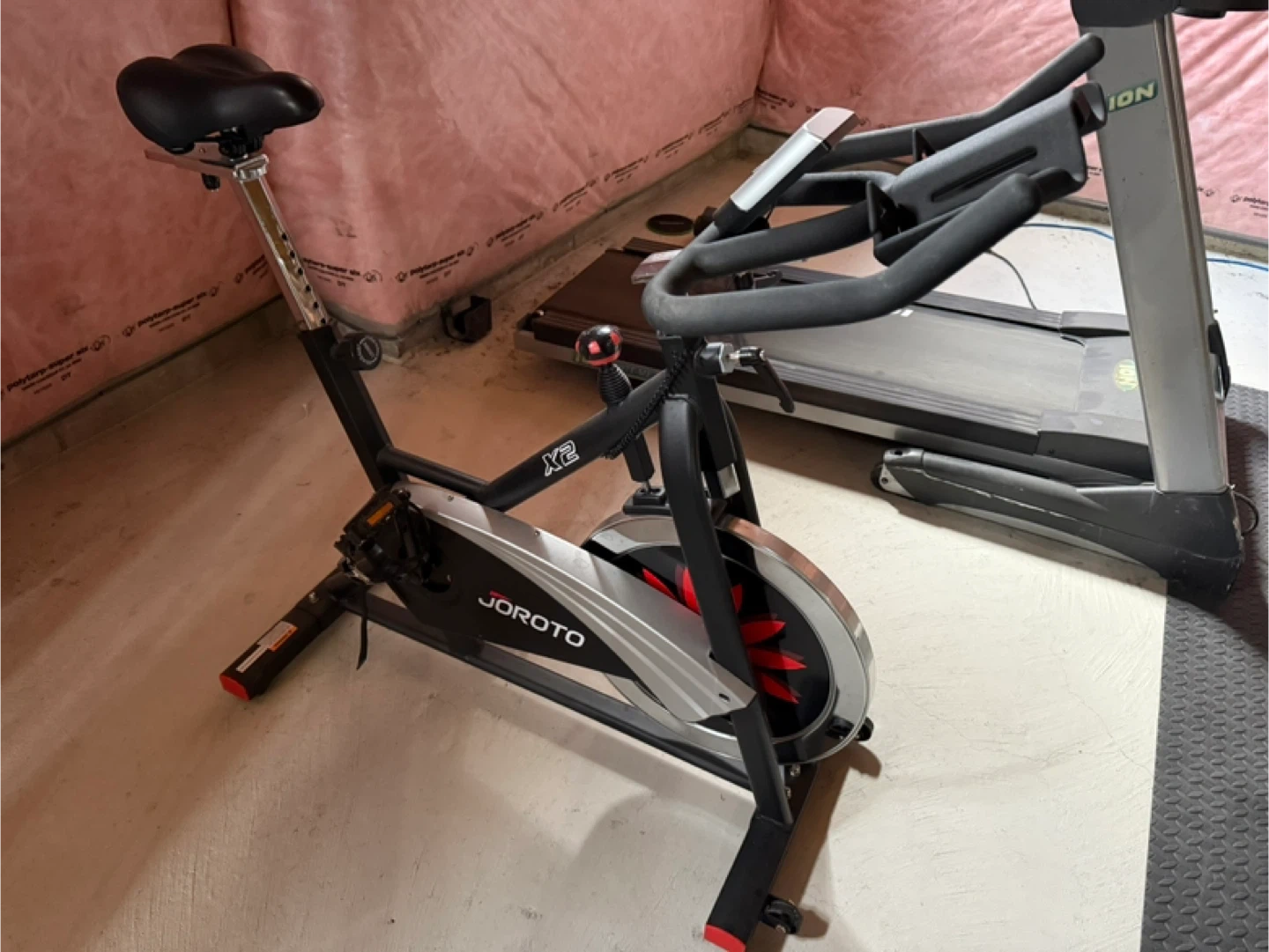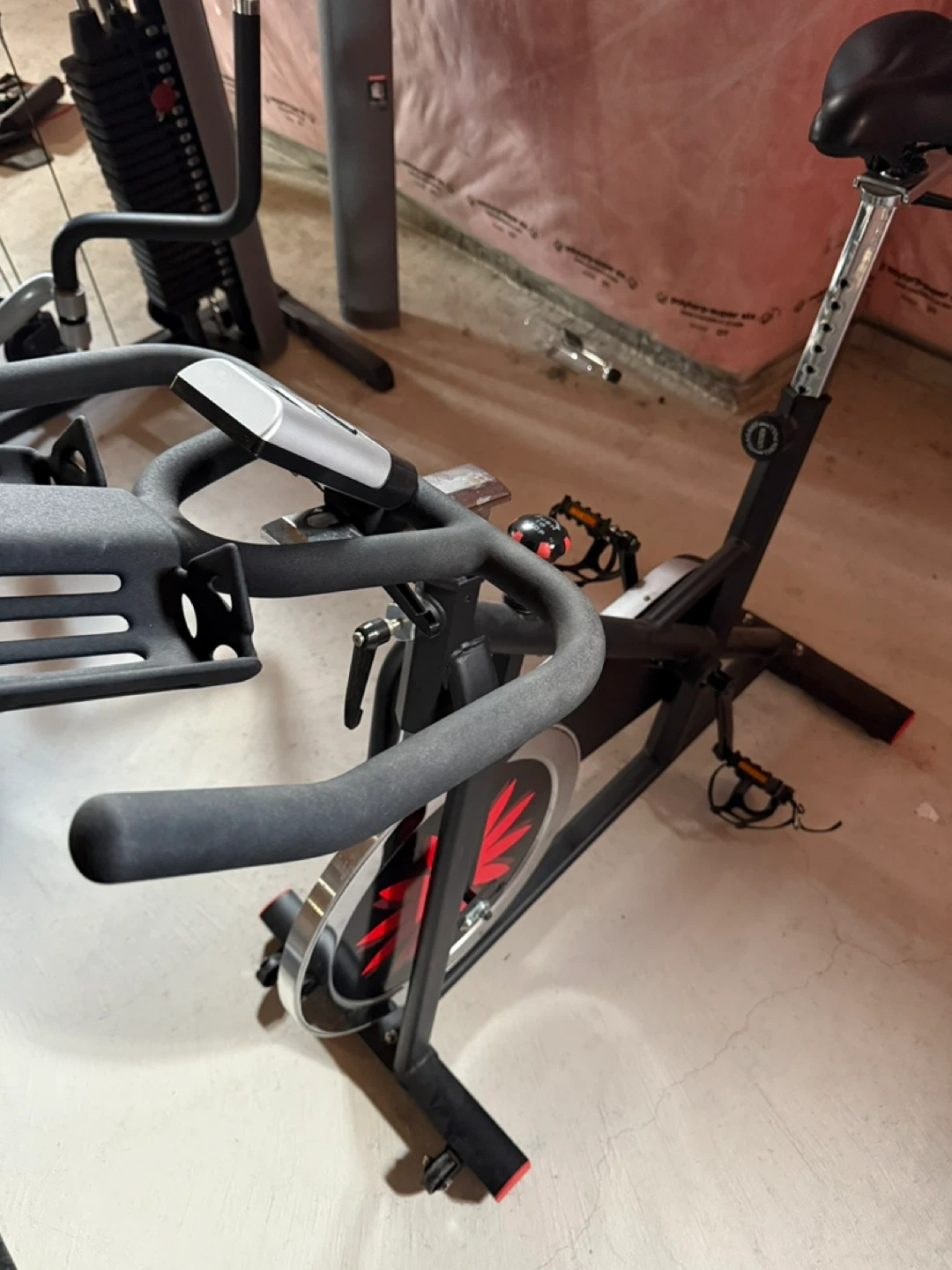 The bike features an adjustable seat and handlebars for comfort. Perfect for home workouts!